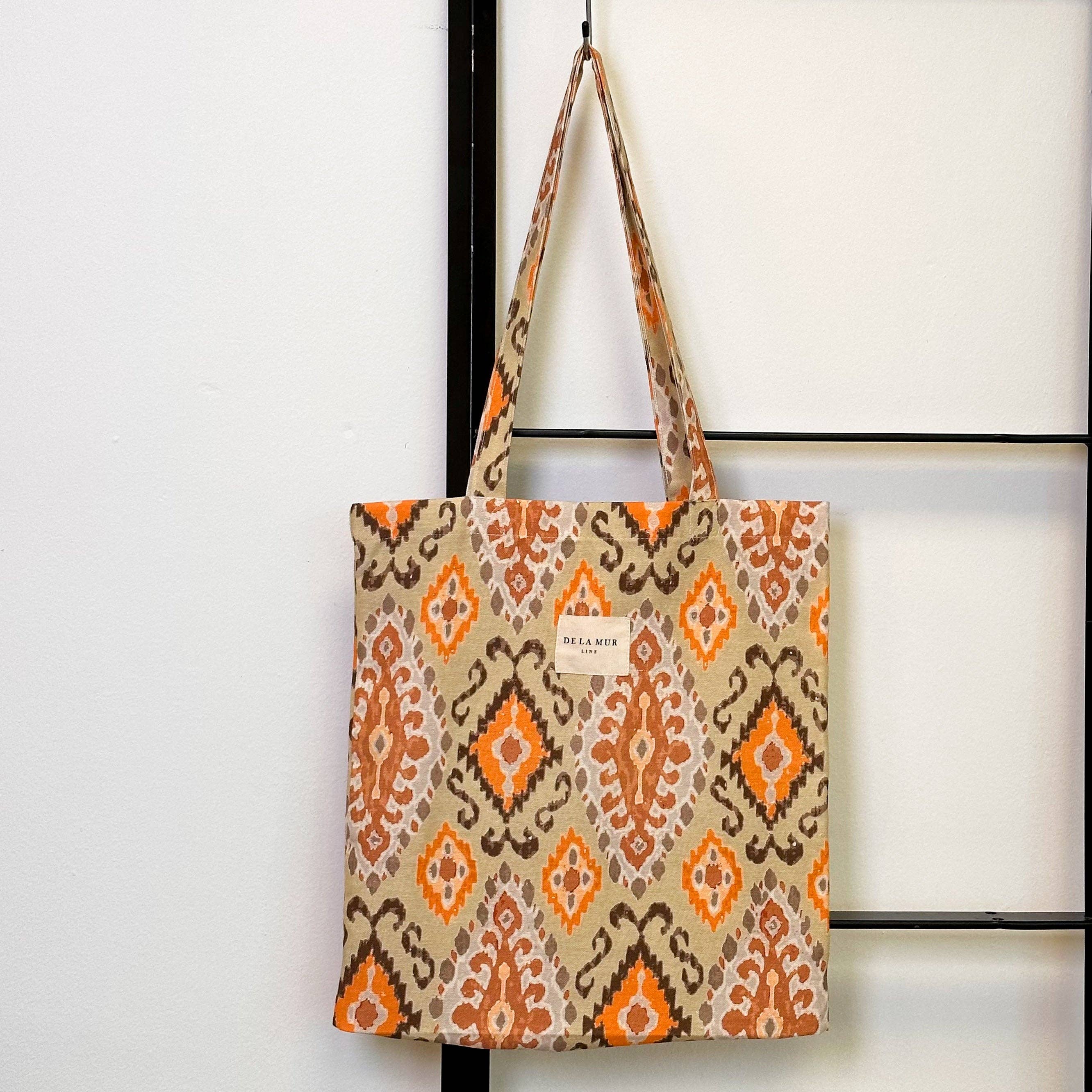 Stor shoppertaske med skulderstropper. Fremstillet i et geometrisk mønstret stof med grønne og okkerfarvede toner. For bedst mulig vedligeholdelse anbefales håndvask i koldt vand, og tørretumbler bør undgås. Bredde x højde: 50 x 39 cm Fremstillet med nationale stoffer.