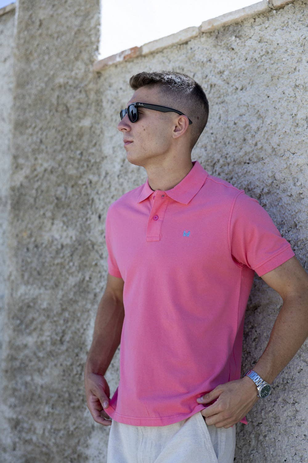 En ensfarvet basis polo i pistaciegrøn, lavet af 100 % bomuldspiqué. Den har en lukning foran med en klap og personlige knapper. Polokraven og ærmekanterne er ribstrikkede for en tæt finish. Små åbninger ved enderne af side-sømmene. På brystet ses en broderet krabbe-logo i kontrastfarve. Halsudskæringen matcher farven på broderiet.