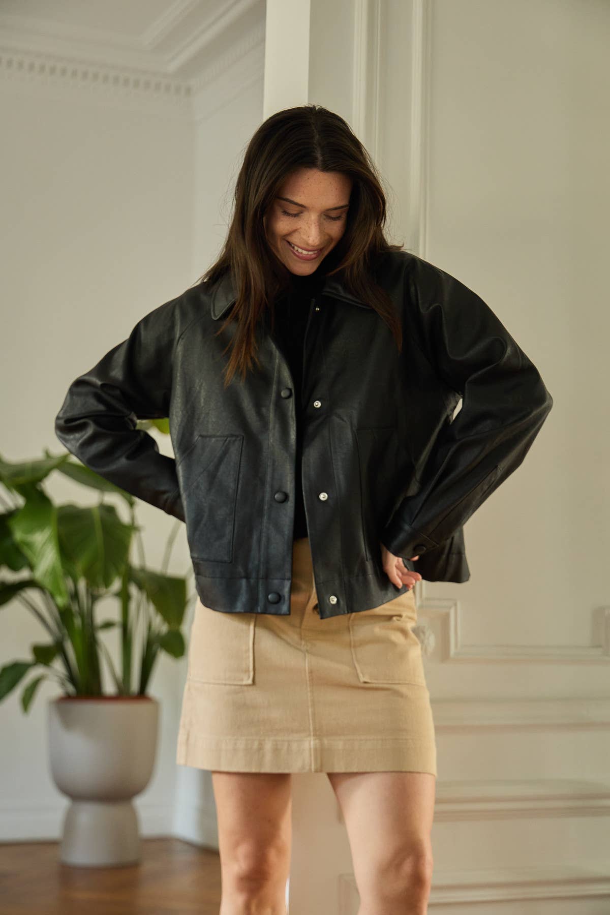 Kort jakke i imiteret læder med moderne pasform og ensfarvet design.