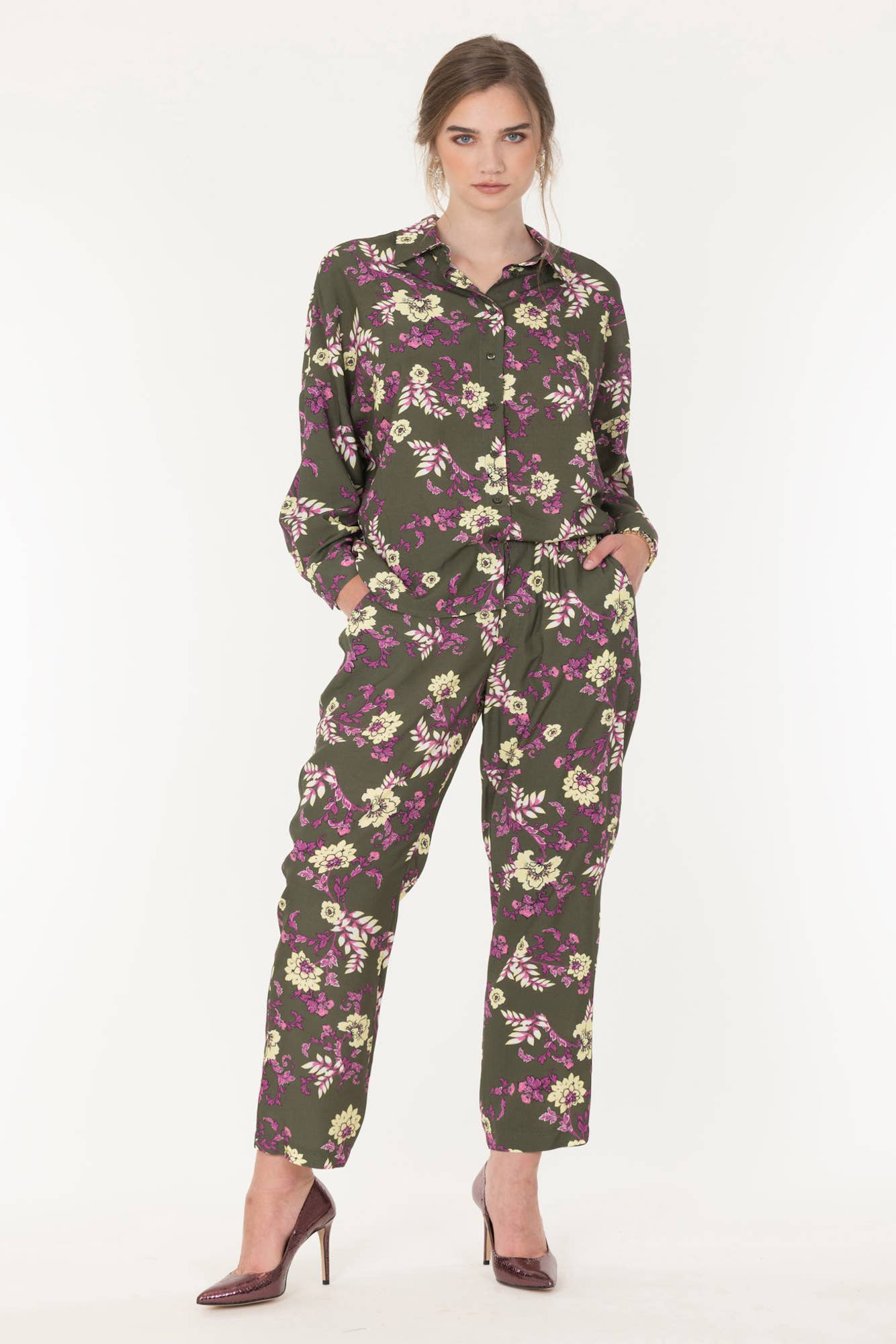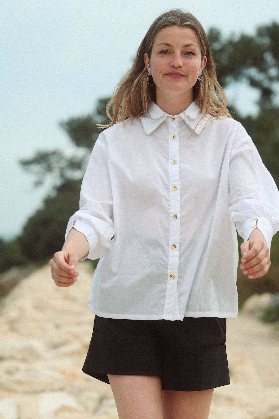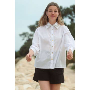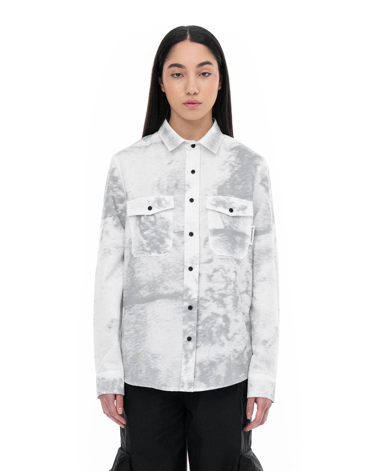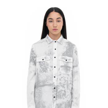 En farveblok, crinkle bomuldstrøje med følgende funktioner: Krave halsudskæring. Lange, brede ærmer. Faldt skuldre. Forreste brystlomme. Knap foran lukning. Rå kant forneden. Afslappet pasform. Model Info: Højde: 5 ft 9 i | Buste: 34 i | Talje: 26 i | Hofter: 37 i | Iført størrelse S.