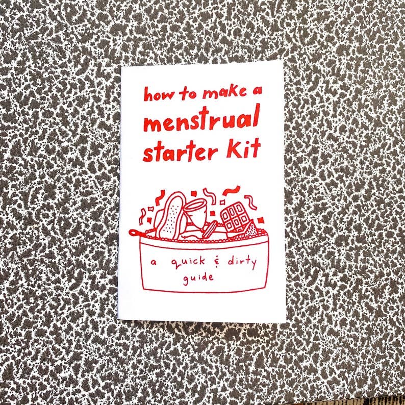Denne zine er en venlig, kønsneutral introduktion til genanvendelige menstruationsprodukter, herunder menstruationskopper, havsvampe og kludpuder. Den indeholder originale illustrationer samt en påmindelse om, at menstruation ikke er grov. Kroppe er fantastiske, og de er i stand til fantastiske ting! Formuleringen er kønsfri for at omfatte mennesker af alle køn, der menstruerer, inklusive nogle transmænd og ikke-binære mennesker. Denne zine blev lavet af Aren of Menstrual Blog (menstrualblog.tumblr.com; tekst og illustrationer) og Nicole Mazzeo fra Pleasure Pie (illustrationer). DETALJER: Denne zine måler 2.75 „x 4.25" og er trykt på standard hvidt computerpapir ved hjælp af blågrøn blæk.