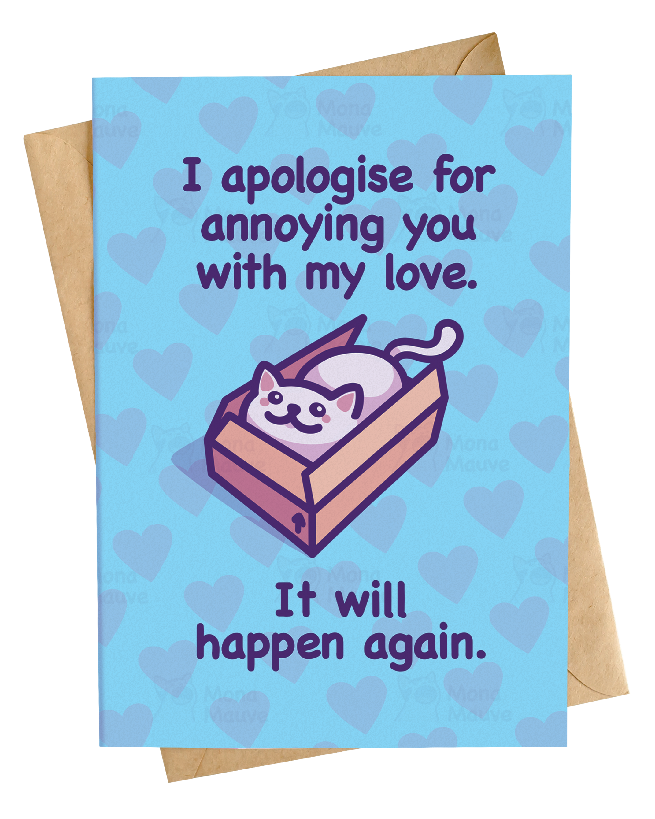 Jeg er forelsket i dig, og det er din skyld - et sjovt og yndigt kort til at udtrykke kærlighed til en, hvis kærlighedssprog er kattememes! 💕 Perfekt til jubilæer eller bare fordi! * Størrelse: A6 (10,5 x 14,8 cm) med en C6 konvolut (11,4 x 16,2 cm) * Designet af Mona Mauve * Inkluderer en brun kraftkonvolut * Kommer i en bionedbrydelig displaypose klar til salg! * Blank indeni * Trykt på premium tungt mat karton (300 gsm) Copyright © Mona Mauve Alle rettigheder forbeholdes