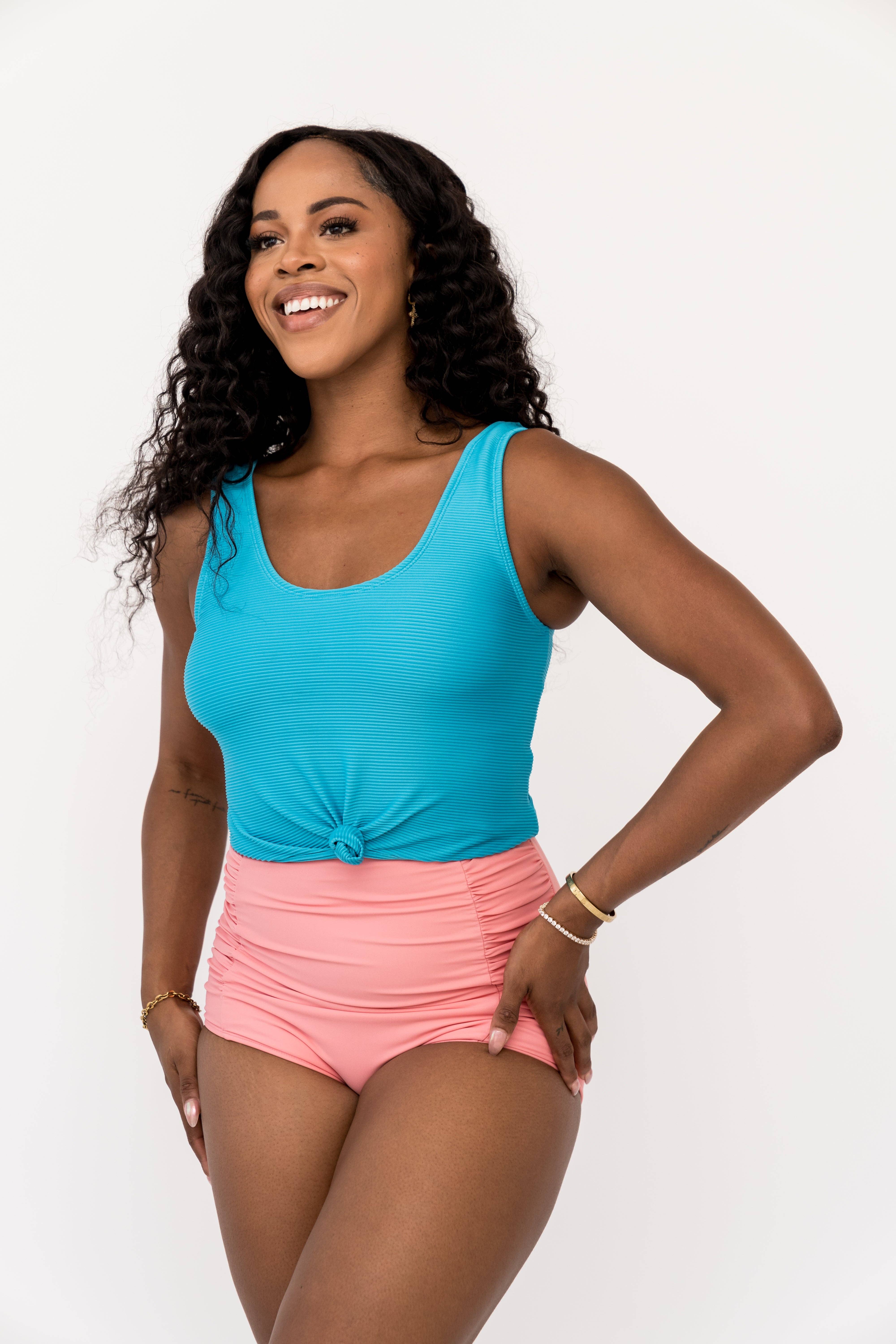 Tankini top med knyttede hvide ribstrikkede strimler til kvinder