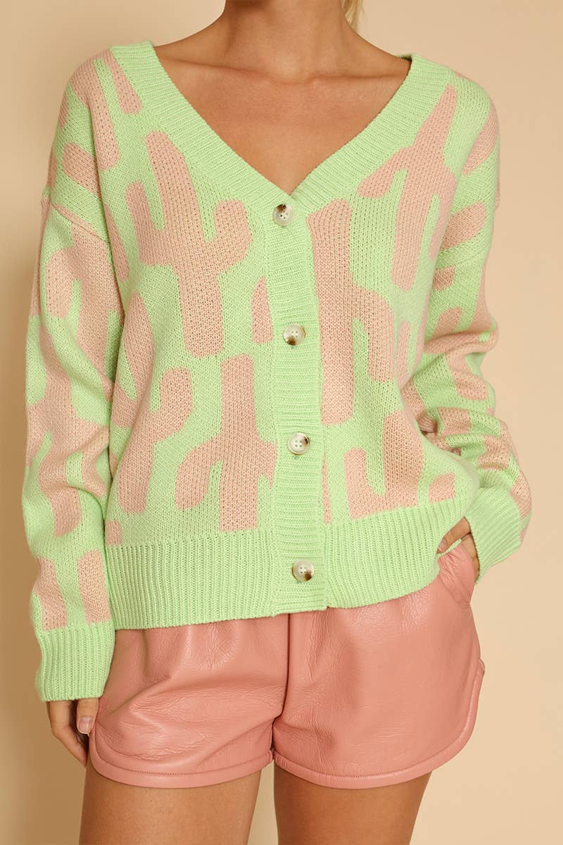 *Eksklusivt internt design* -Kaktus og retro stribe intarsia -Knaplukning foran -V-udskæring -Alt originalt design 85AKRYL 15POLYESTER