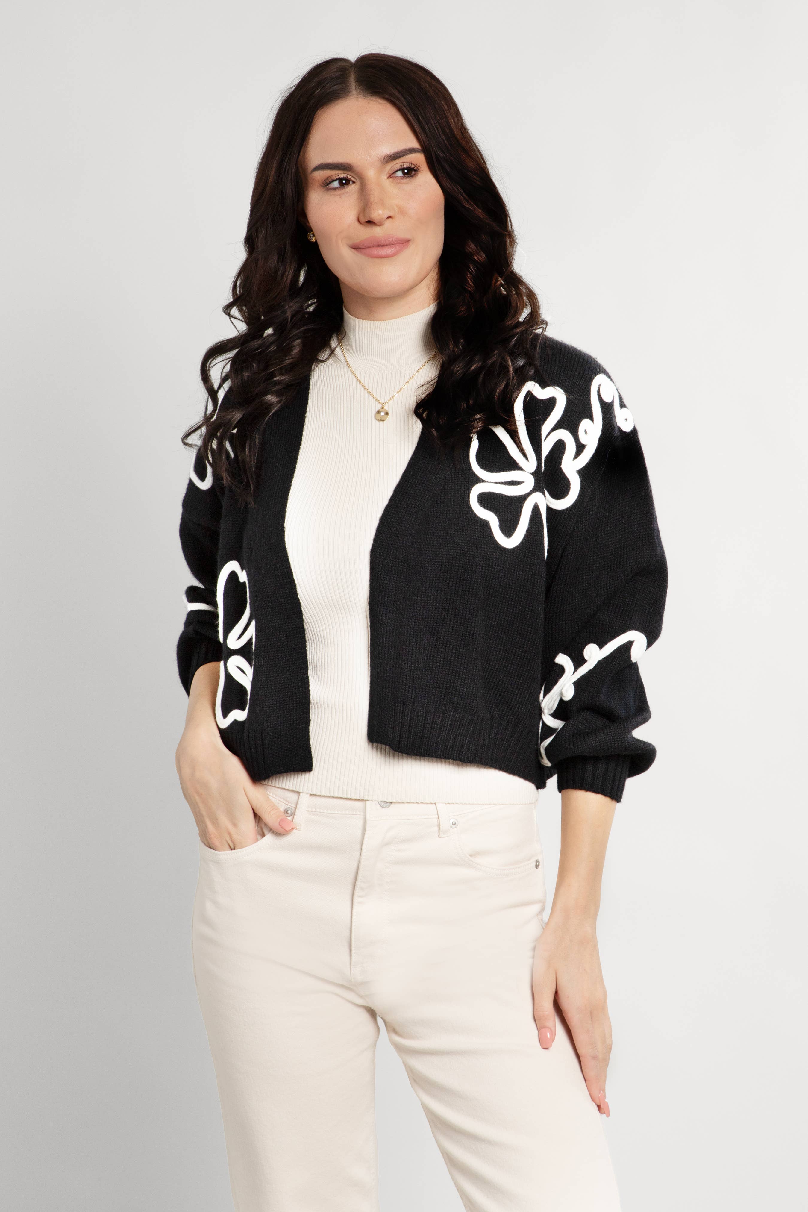 Legesyg charme møder moderne elegance med vores beskårne blomstercardigan med krøllet design. Delikate blomstermotiver danser med fængslende krøller, afsluttet med ribbede detaljer. Denne korte sweater tilføjer et strejf af moderne flair til dit jeans eller kjole-look. „-Materiale: 100% Akryl -Længde: 19" -Bredde: 21,5“ -Armhul: 10"