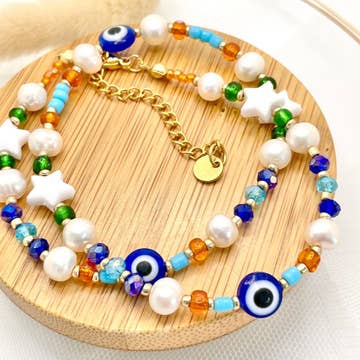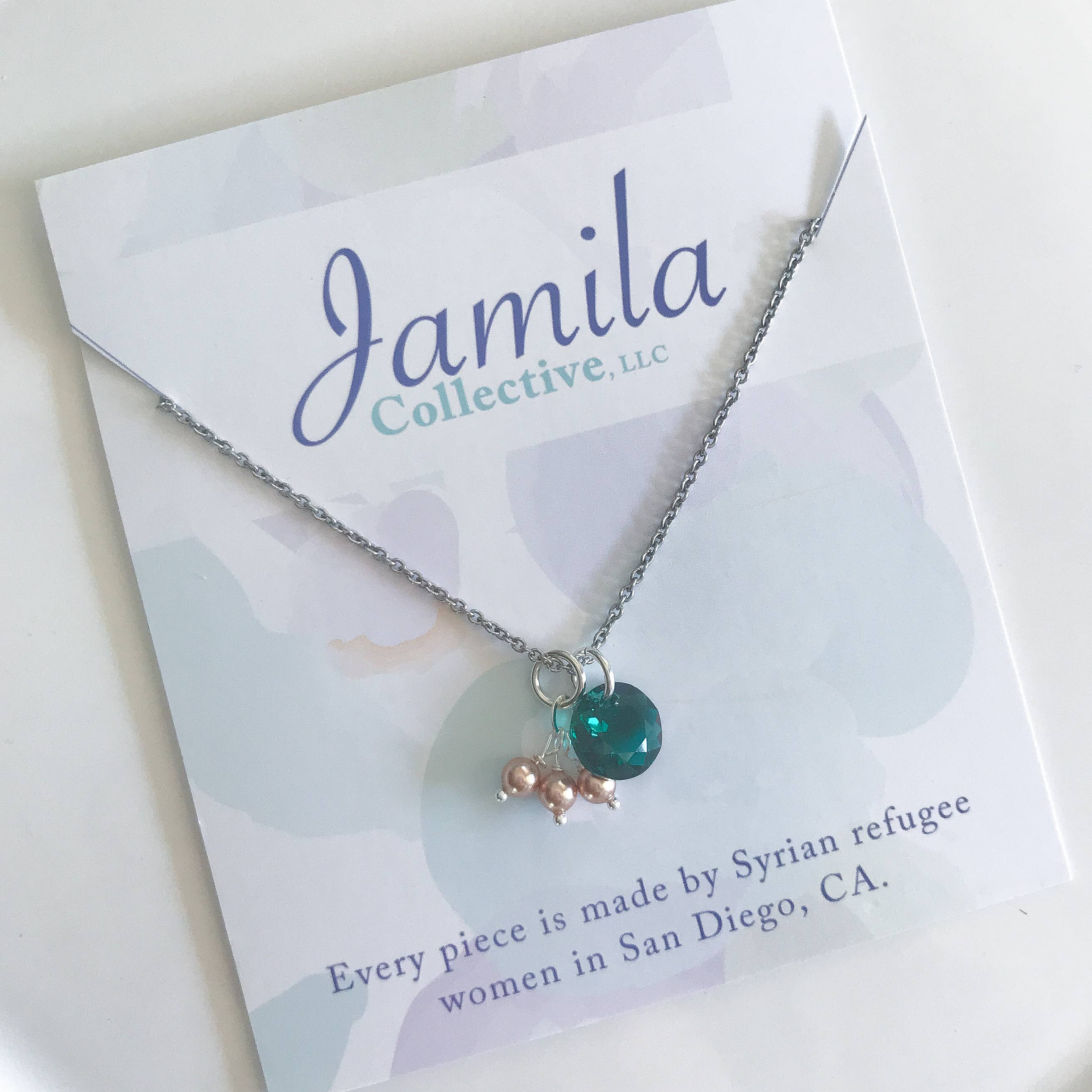 Halskæden er 36 inches lang. Bær det længe eller fordoble det op! Denne halskæde kommer i flere farve combos. De er ideelle til et tilbehør sektion af et tøj eller gavebutik. Denne fortegnelse er for White Ferskvandsperle og Clear Swarovski® krystal farve combo. Hvert stykke er håndlavet af syriske flygtningekvinder, der bor her i San Diego.