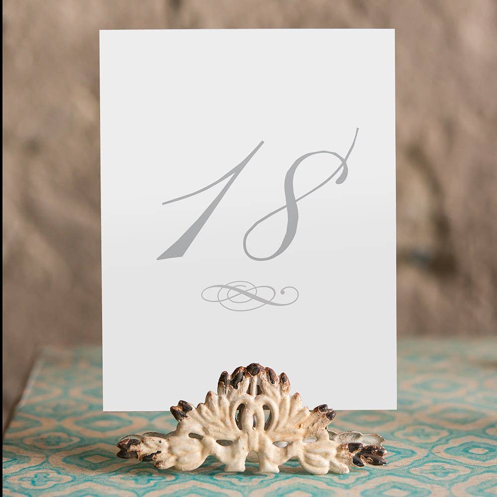 Denne dekorative papirvarer Holder vil tilføje elegance til enhver bordplade display. Brug med bordnumre, menukort, bordhilsner, fotografier, stedkort eller enhver anden form for papirvarer, der kræver lidt prestige. Kombiner med Tall Ornamental Wire Holdere for at skabe et koordineret look. Lavet af tråd med hvid finish. Denne vare sælges i pakninger af 6 pakninger 4 5/7" (L) x 1 1/6" (B) x 2" (H) Coated Metal legeret tråd