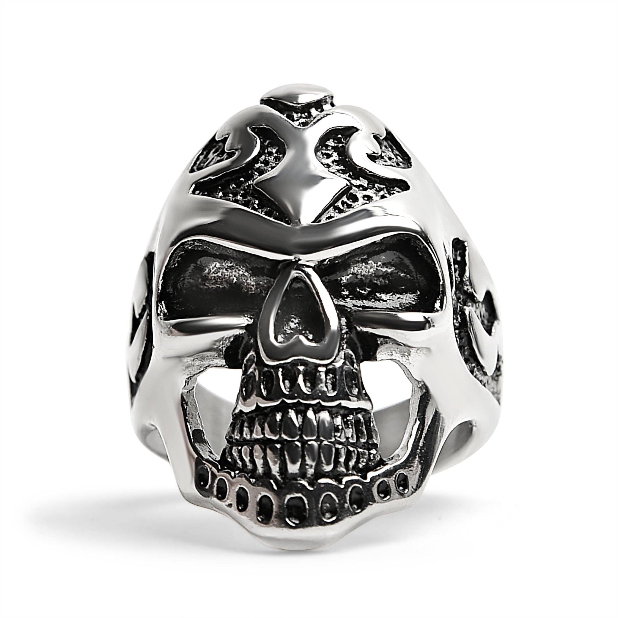 Denne detaljerede kraniumring i rustfrit stål har et indviklet kraniumdesign, der er både stilfuldt og unikt. Detaljeret håndværk vil helt sikkert imponere! Denne ring er allergivenlig og oxiderer ikke over tid, hvilket gør den perfekt til daglig brug. Den enkle sølvfinish sikrer, at denne ring passer til ethvert outfit. Uanset om du ønsker at tilføje et strejf af edgy stil til din garderobe, eller blot ønsker et unikt smykke at vise frem, vil denne ring helt sikkert tiltrække opmærksomhed. ✦ Stærk, holdbar og går ikke let i stykker. ✦ 316L kirurgisk rustfrit stål vil aldrig falme, anløbe eller gøre huden grøn, selv når den bæres i havet eller poolen. ✦ Allergivenlig, så du behøver ikke bekymre dig om udslæt eller irritationer! ✦ Et godt alternativ til .925 Sterling sølv. Ca. vægt: 29 gram