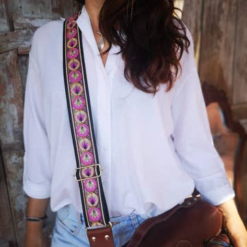 Tilpas din taske med vores nyeste guitarrem lavet og designet af Ampere Creations. Cirka maksimal faldlængde er 27 tommer. -Lavet af vores genanvendte bomuld -Kan tilpasses under vores „Bæredygtig samling“ -Justerbar op til 27 „tommer -Designet og hentet af Ampere Denne guitarrem er specielt designet til følgende stiler/SKU'er: #C136 - Mimi Crossbody #C137 - Betty Crossbody #C139 - Zara Crossbody #T109 - Katrina Taske VARENR.: #STRAP 1007-TRIBAL 9