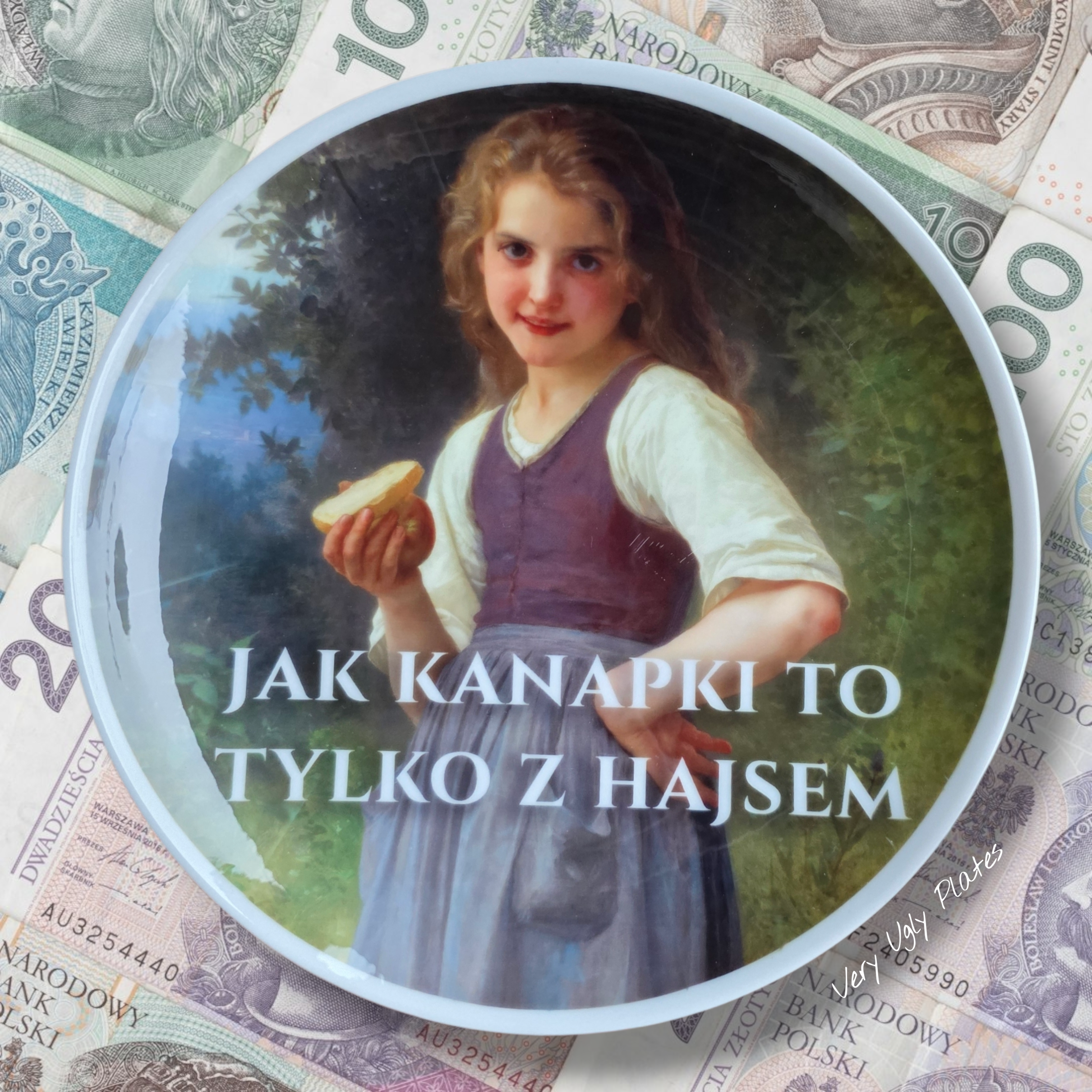 Very Ugly Plates started as an art project in 2019 in Berlin. I was finding old porcelain plates on fleamarkets and painted funny captions to completly change the story on them. Now to be able to work with shops and also to have more artistic freedom I print my own plates.