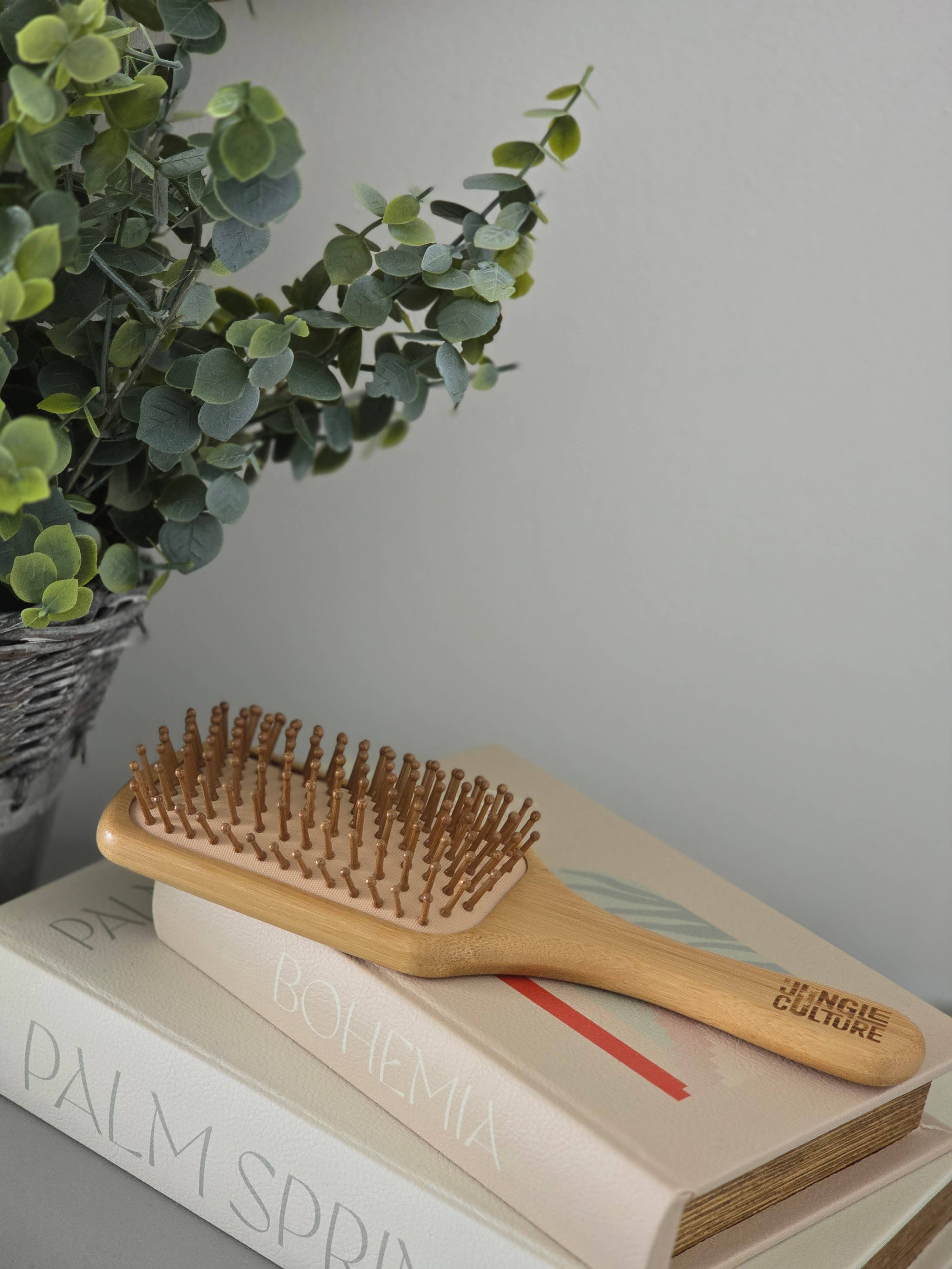 Premium Bamboo Hairbrush - Paddle brush design for scalp massaging and promoting hair growth! (Affordable Christmas present ideas) Jungle Culture’s bamboo hairbrush is designed using eco-friendly bamboo to suit all hair types. Whether your hair is curly, thick, straight or fine, this sustainable hairbrush will work for you. Our pressured paddle surface and soft bristles allow you to brush your hair wet or dry without causing irritation! We use ethically sourced bamboo to produce our natural and organic hairbrush handles and package our bamboo hair brushes in a recycled zero waste kraft paper box. The soft bamboo bristles on our eco paddle hair brushes are designed to massage your scalp and head, stimulating blood flow and promoting hair growth, whilst our wooden hairbrush handles are delicately shaped to give the user an ergonomic brushing experience. Set Contains: 1 x Bamboo Hair Brush 1 x Plastic-free Kraft paper presentation box