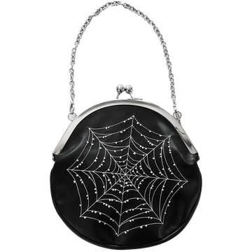 This elegant purse weaves vintage allure with gothic mystique. Crafted from black vegan leather, it provides the perfect canvas for intricate white spiderweb embroidery, adorned with dew drops. While it won't ensnare any insects, it's sure to capture you plenty of compliments! Also available in bone and cognac. - Comes with two different length chains so you can convert from a top handle into a crossbody purse. - Interior zipper compartment and credit card holder. - Measures 8" x 8" x 1.5". Fits any size phone and much more! - Stylish and secure kiss lock clasp.