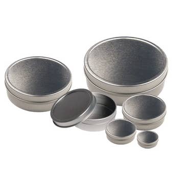 Seamless container with slip-on lid made of tin-plated steel. Used for home organization for holding small items and for product packaging for items such as lip balms. Available in 2 sizes: 0.25 oz size: 1 5/16" diameter x 9/16" high 1 oz size: 1 5/16" diameter x 3/4" high