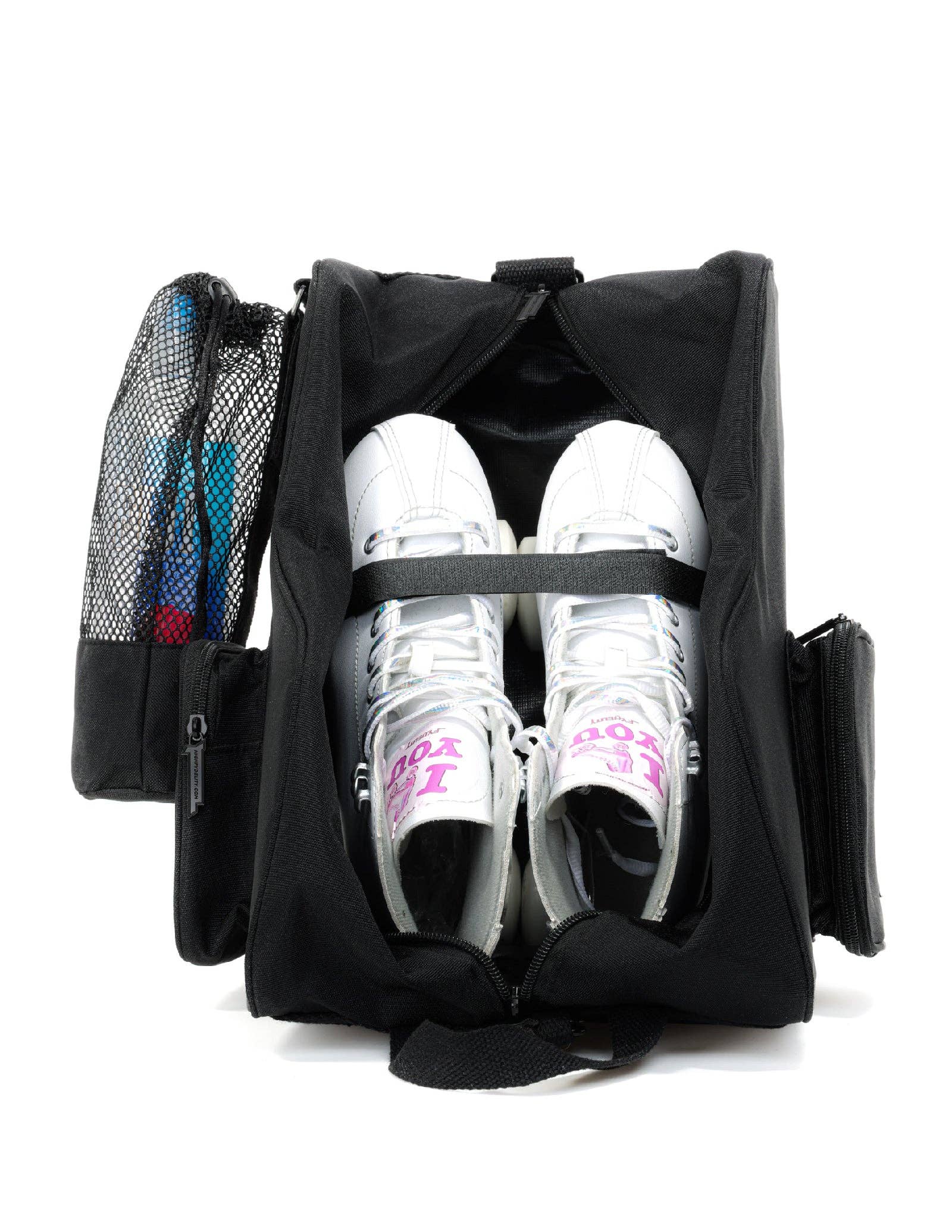 Freewheelin' Roller Skate Crossover Backpack Bag - the ultimate fusion of fashion and function for all skating enthusiasts out there! 🎉 Features: Innovative Features: "Skate seat-belt" system to hold skates in place securely. Shoulder strap that doubles as a skate leash for quads. Sturdy Construction: Made from durable corduroy. Heavy-duty tarpaulin lining and bottom for added protection. Specialized Compartments: 2 side wheel pockets for secure skate storage. Interior stash pocket for personal items. Detachable 1-liter water bottle holder for easy hydration. Additional Storage: Extra pockets for carrying skate accessories and other essentials.Breathable mesh water bottle bag included. Dimensions and Capacity: Dimensions: 14" x 12" x 8.5" (35.5 cm x 30.5 cm x 21.5 cm) Volume: 23 liters