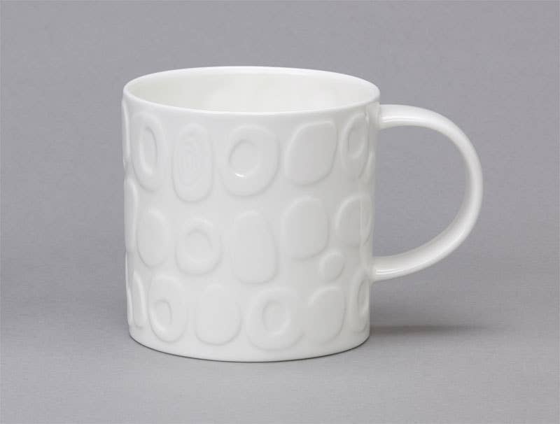 Tubby: Shapes Height: 80mm Capacity: 350ml Bone China Made in Stoke-on-Trent, England Design: Gillian Naylor and Mark Faulkner @ Repeat Repeat The Tubby Shapes is part of our popular white bone china range with raised 3D patterns. It’s generous in size and lovely to hold, and features a amorphic shapes, a nod to our appreciation of mid-century design. And it makes a simple cup of tea or coffee feel that little bit more special. Our bone-china mugs are made the traditional way, starting with liquid clay poured into a mould by hand. The mug then goes through around 20 hand processes, as well as three firings in a kiln before it’s ready. Because they’re made by hand, our mugs may differ from each other very slightly, which we think adds to their charm and character. The quality is first rate, just as you would expect from bone china made in England. Dishwasher Safe: Yes Microwave Safe: Yes
