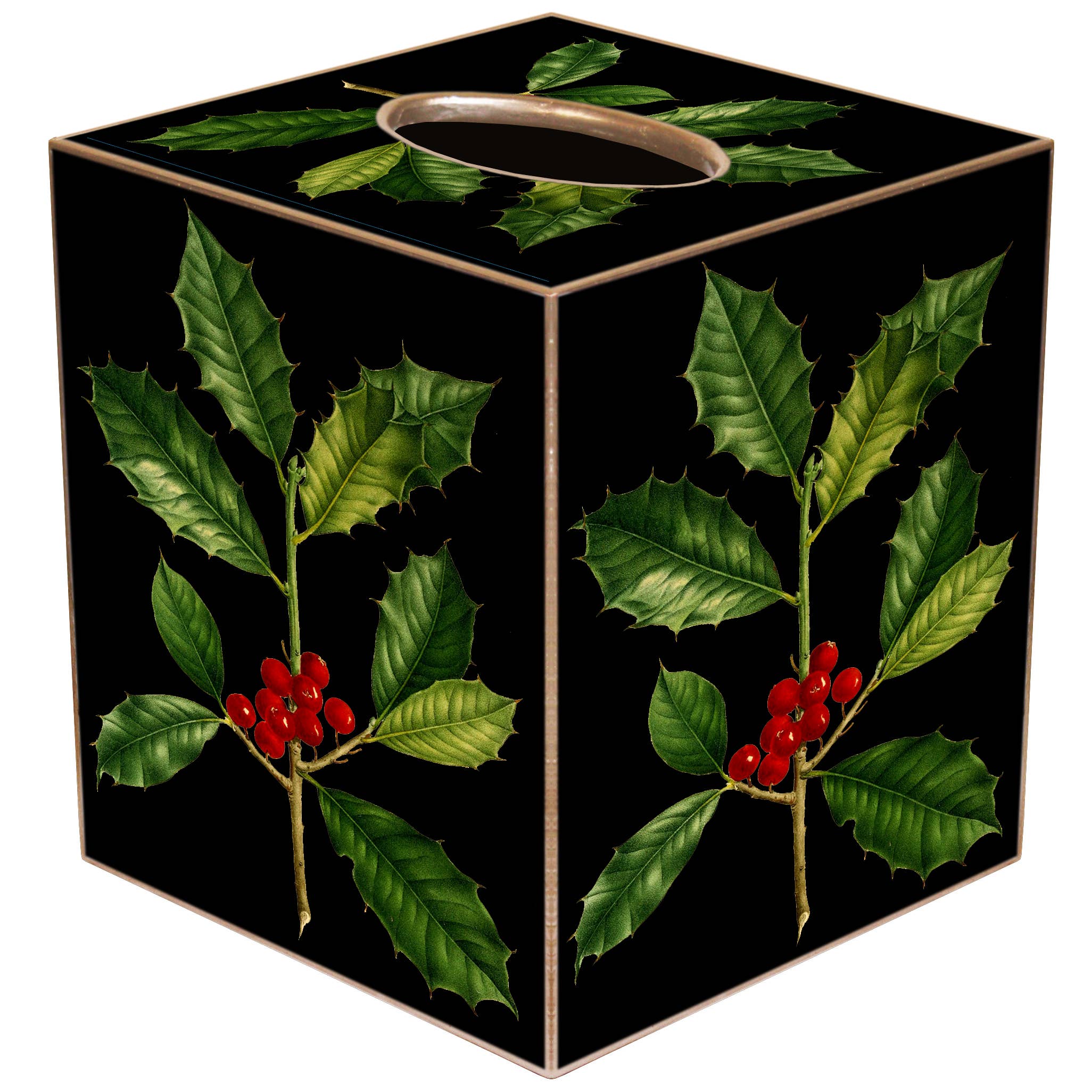 Our decoupage tissue box covers are handmade to order by our wonderful team in Houston, TX. They easily slide over any cubed tissue box cover. The artwork is hand-cut, decoupaged, and polished. Each tissue box cover is hand painted in gold or silver around the edges as the finishing touch. We offer 3 materials for the tissue box covers: 1. Papier Mache: $19 Dimensions: 5.5” H x 5” W x 5” L 2. Wood: $30 Dimensions: 5.25” H X 5” W X 5” L 3. Tin: $30 Dimensions: 5.75” H x 5.125” W x 5.125” L