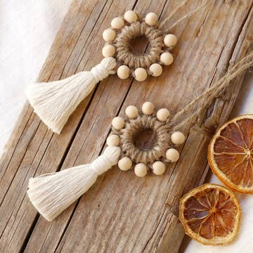 Macrame Christmas Wreath with Tassel Add something eco-friendly to your Christmas tree this year with this beautiful Macrame mini wreaths ornaments made with natural materials. Macrame goes very well with neutral, boho and rustic decor. Can also be the perfect extra touch to a holiday gift. Approximately 7cm in diameter and the total length with the tassel is 12cm. Material : jute and cotton cord