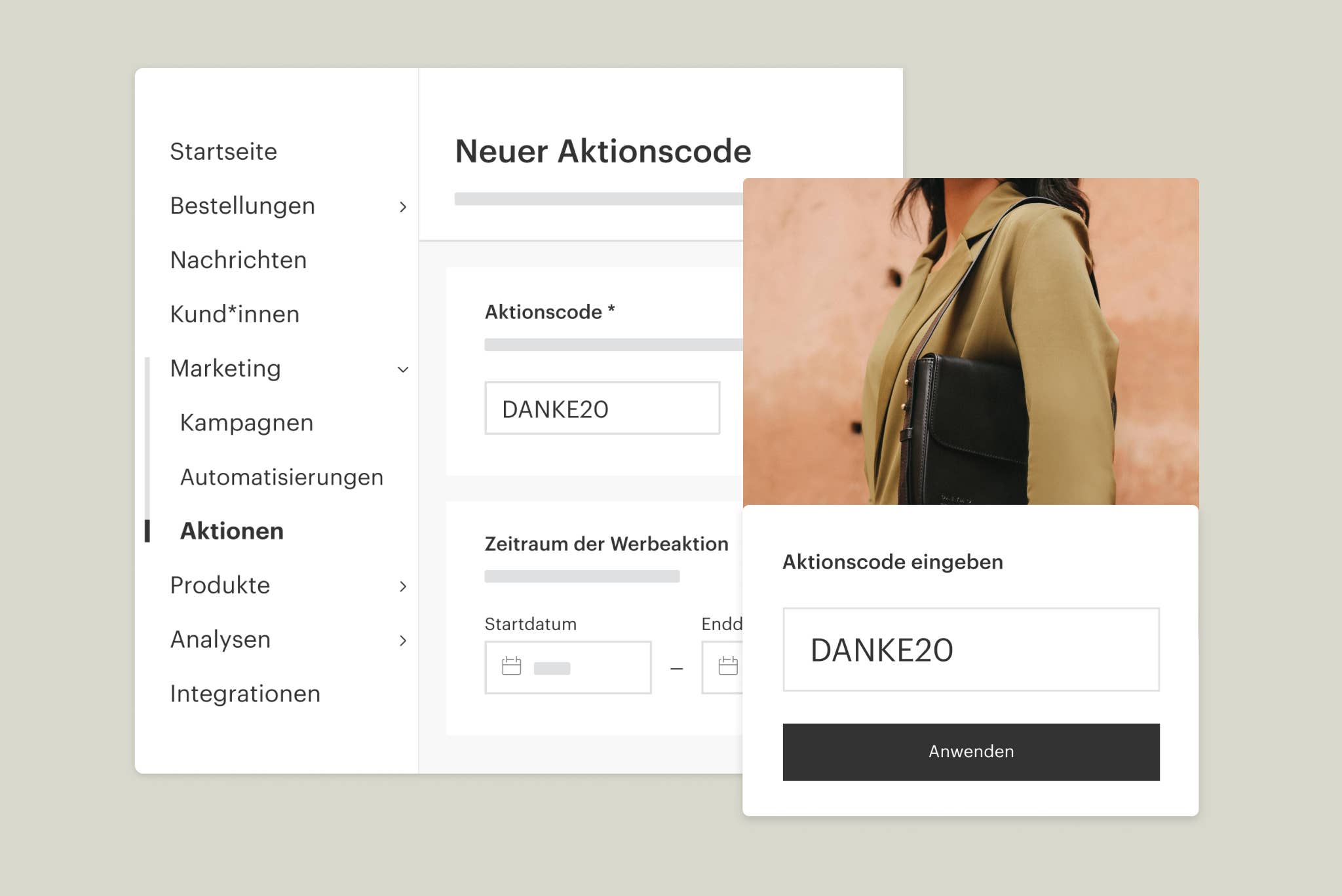 Du kannst ganz einfach einen Aktionscode erstellen und teilen. Sobald du dir einen Namen, die nötigen Daten und Details zum Rabatt für deine Aktion überlegt hast, geh unter Marketing auf Aktionen oder auf die Kund*innen-Seite in deinem Markenportal. Du kannst deinen Aktionscode bestehenden oder potenziellen Kund*innen mit einer E-Mail oder einer E-Mail-Kampagne, über Social Media sowie persönlich auf Messen mitteilen. Weitere Details, Angaben zu Einschränkungen und Infos darüber, wie du individuelle Aktionscodes teilst, findest du in unserem Helpcenter.