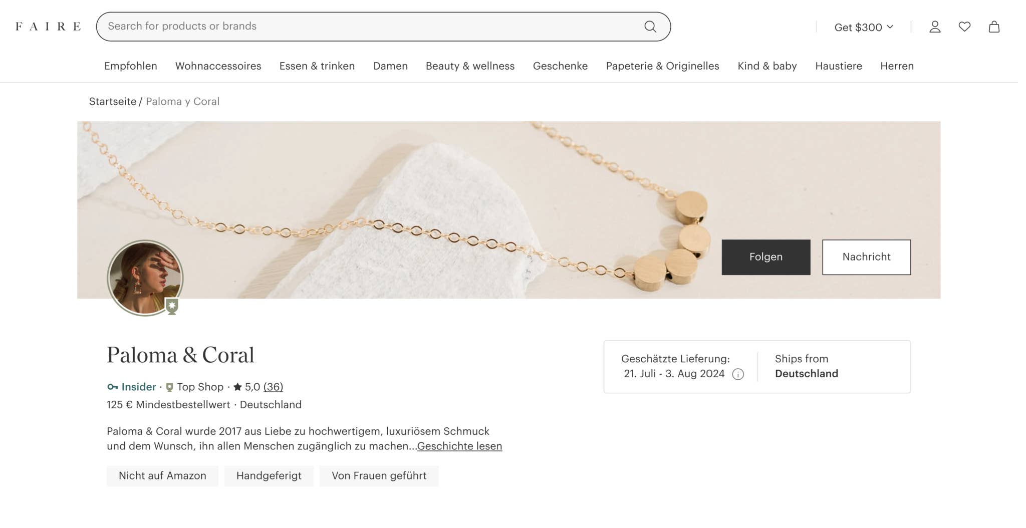 ** Im Vergleich zu Marken derselben Kategorie auf Faire mit einer ähnlichen Anzahl von Einzelhändler*innen und mit mehr als fünf Bestellungen in den letzten 90 Tagen.