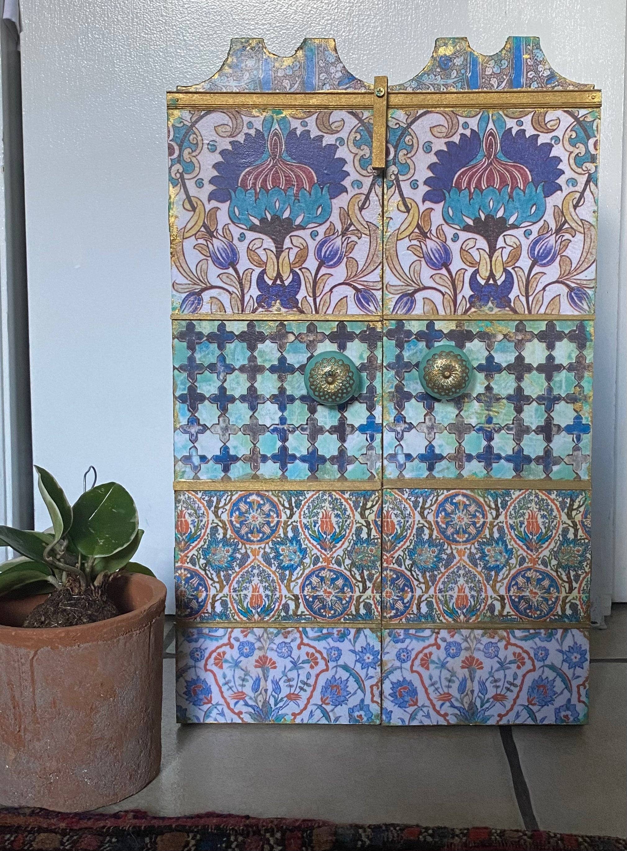 Bazaar Zauber ist ein Fest verschiedener Kulturen, bei dem ich kreative Inspiration finde. Angefangen bei meinen von Marokko inspirierten Schränken, gefolgt von Decoupage-Lichtschaltern und Muschelschalen, die die Schönheit antiker Teppiche und Fliesen nutzen.