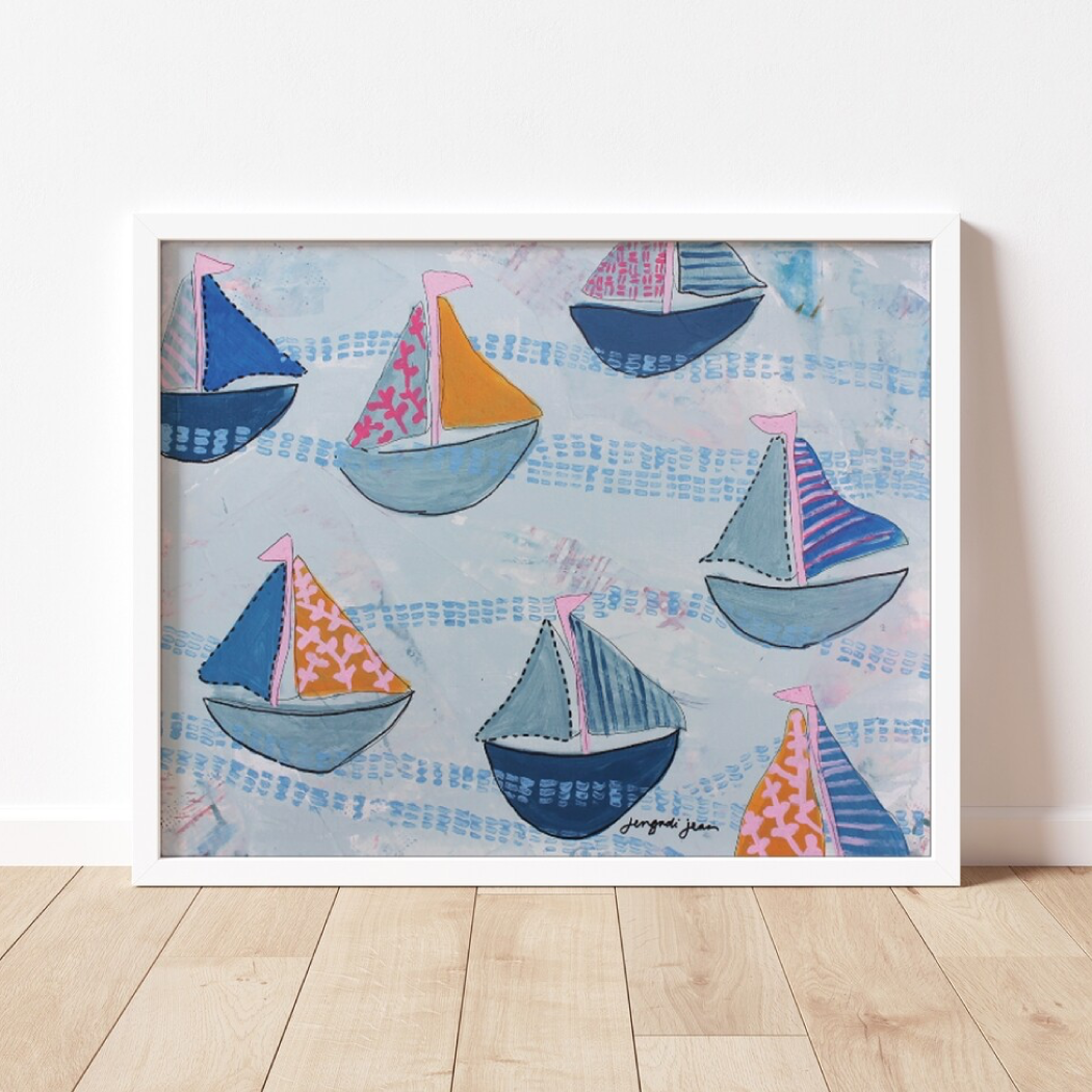 Jen (Jengadi Jean) ist ein bildender Künstler aus Neuengland. Ihre Liebesbeziehung mit Wasser begann bereits bei ihren ersten Erinnerungen an Reisen nach Cape Cod. Im Nordosten zu leben, dauert es nicht lange, bis man zum Meer kommt. Die Sommer im Familienhaus ihrer besten Freundin an der Küste von Maine besiegelten ihre Besessenheit vom Meer. Sie hofft, dass sich ihre Bilder das ganze Jahr über wie ein Hauch frischer (und salziger) Luft anfühlen. Mit Schattierungen von Seeglas und hellen Farben der Promenade werden Sie beim Schielen zurück zu diesem geschichteten Horizont am Meer transportiert. Jen schloss 2011 sein Studium am Grove City College in Western PA mit einem Abschluss in Psychologie ab. Während ihrer Schulzeit beschäftigte sie sich mit Kunstkursen und absolvierte Aufträge für Freunde und Freunde von Freunden auf dem gesamten Campus. Kurz nach ihrem Abschluss begann sie, Vorschule zu unterrichten und füllte ihr Klassenzimmer mit Kunst, Installationen, Bildbänden und Worten von Picasso, um Kreativität und Fantasie zu fördern. Nach einer Gesundheitskrise mit 24 Jahren verließ sie den Unterricht, um ihren Traum, Designerin und Künstlerin zu sein, Vollzeit zu verwirklichen, und hat nicht zurückgeschaut.