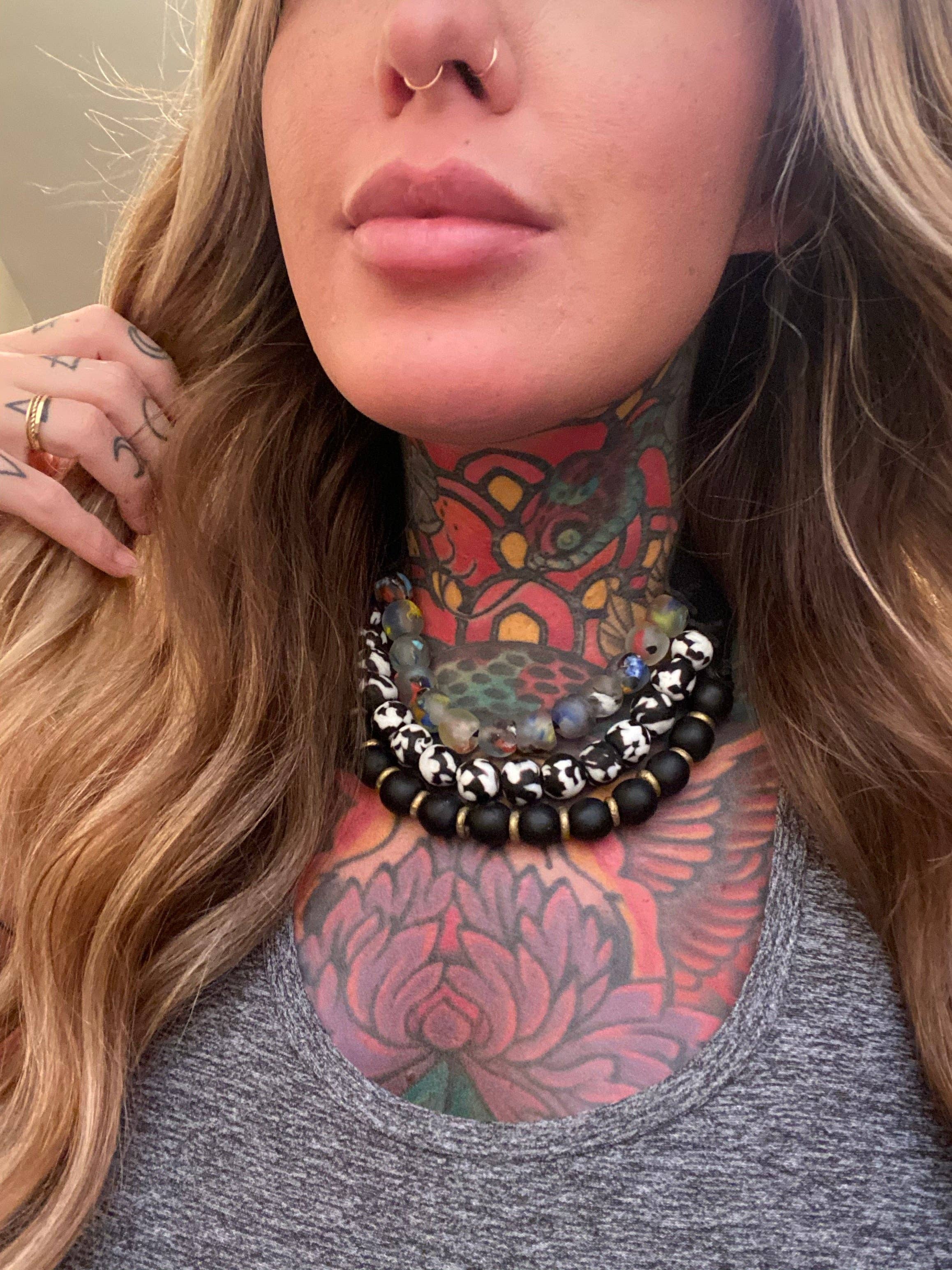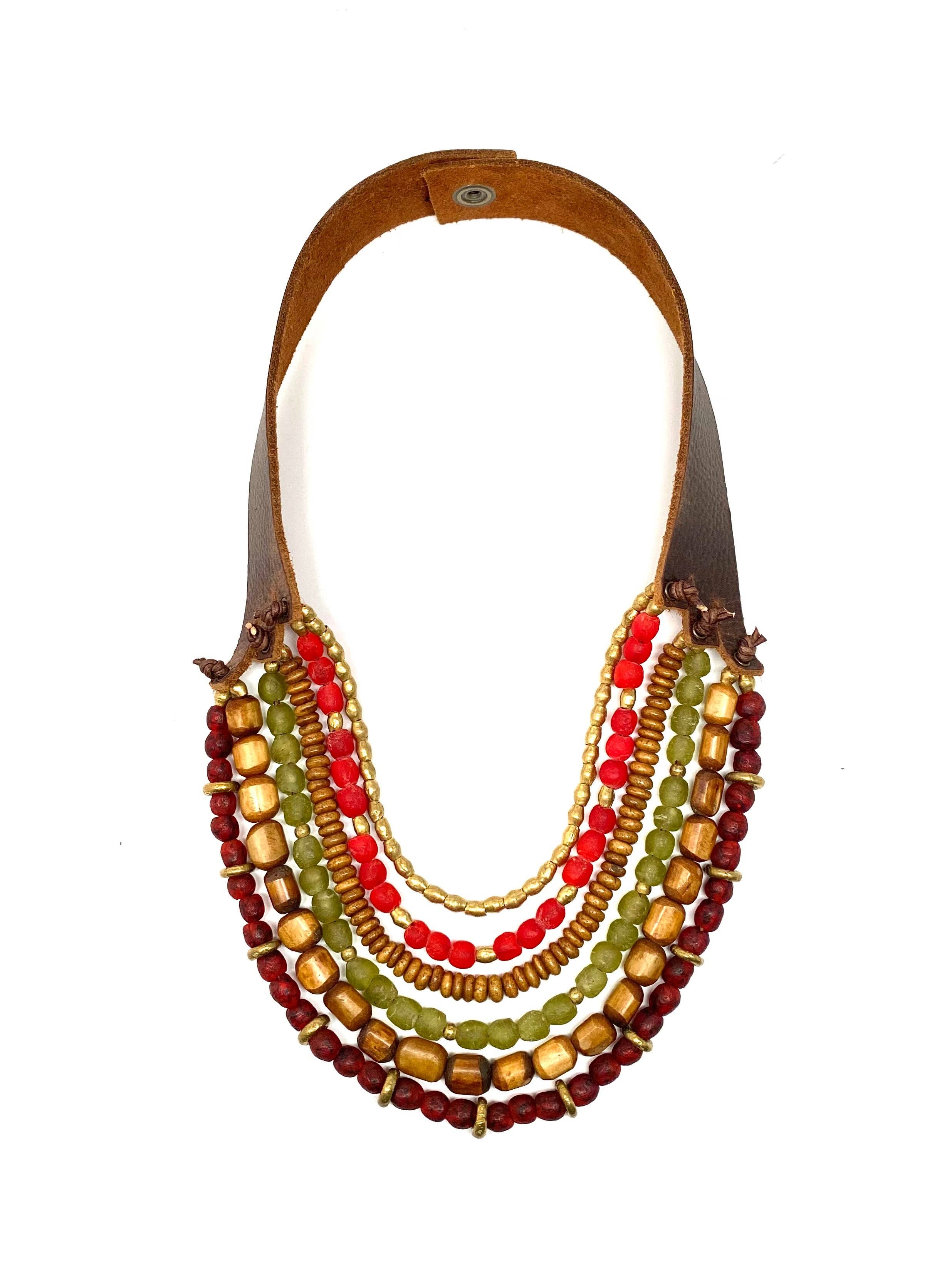 Jedes Stück ist brandneu - wie ein neues Paar Schuhe zum Einbrechen - die Perlenstickerei ist eng gewebt, sie entspannt sich, je länger Sie sie tragen. Jede Perle wird von Hand in extrem kleinen Chargen hergestellt, das macht jedes Stück wirklich zu einem Unikat. Aufgrund der organischen Form jeder Perle kann es dazu kommen, dass jedes Stück etwas anders passt. Probieren Sie jedes Armband an, um sich ein Bild von der Größe zu machen. Aufgrund der individuellen Perlengröße kann es sein, dass jedes Stück nicht exakt gleich verziert ist. Verschiedene Stämme haben unterschiedliche Poliertechniken, sodass die Oberfläche jeder Perle variieren kann. Mit der Zeit können Ihre Perlen aufgrund der Öle in Ihrer Haut einen natürlichen Nagellack bekommen. Sie können diesen Vorgang auch beschleunigen, indem Sie Ihre Perlen mit einem leichten Öl oder einer Lotion auf Ihre Perlen massieren. Ihr Leder wird mit der Zeit geschmeidiger, die Riemen passen sich Ihrem Hals an und wie die Perlen bewahren Ihre natürlichen Hautöle das Leder und altern wunderbar einzigartig.