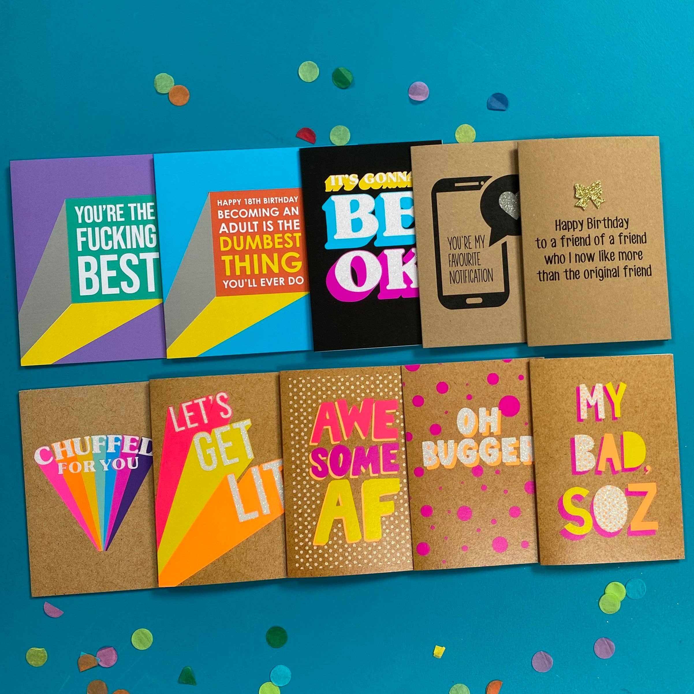 Unser Sortiment wurde vom Künstler Andy Cordina entworfen und kreiert und stützt sich auf Andys Erfahrung, ein verärgerter Aussie zu sein, der in London lebt und sich immer noch über den Mangel an gutem Kaffee und die Knappheit an Sonnenschein beschwert. Nachdem Andy zehn Jahre in der Stadt gearbeitet hatte, entschied er, dass es Zeit für eine Veränderung sei und Bettie Confetti geboren wurde. Ein bisschen links von der Mitte, frech, so leicht beleidigend oder etwas abseits, wie auch immer Sie Bettie Confetti Karten sehen, sie werden Sie garantiert zum Lachen bringen. Und was ist die Welt ohne Lachen? Wir haben es gesehen. Es ist die Central Line on Londons Underground zur Hauptverkehrszeit und es ist nicht schön. Immer ihren Hut an die große Kunst des Sarkasmus zu kippen, fliegen unsere Karten konventionellen Grüßen gegenüber. Es gibt keinen Ausdruck von tief empfundenen Emotionen, kein Teddybär in Sicht und gerade genug passives aggressives Gefühl, um ein Lächeln auf Ihr Gesicht zu zaubern. Alle Karten werden in Großbritannien gedruckt und einzeln mit einem passenden Umschlag verpackt. Sie werden dann von Hand fertiggestellt und in unserem Studio in London verpackt.