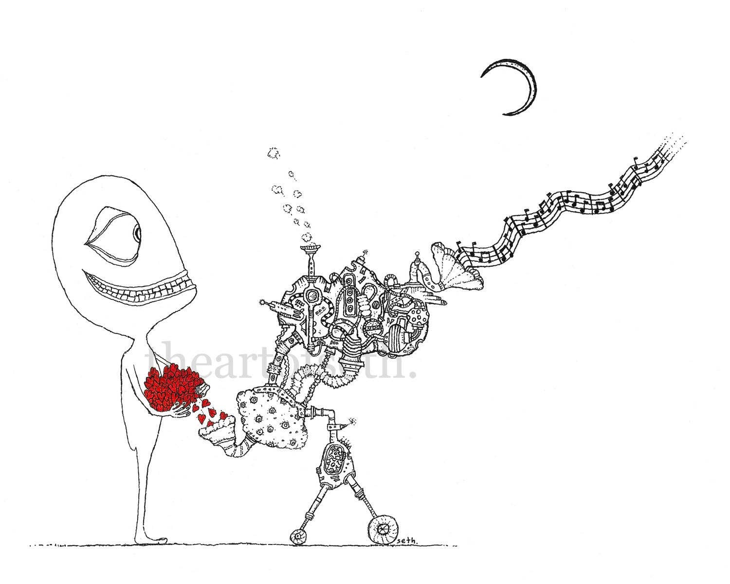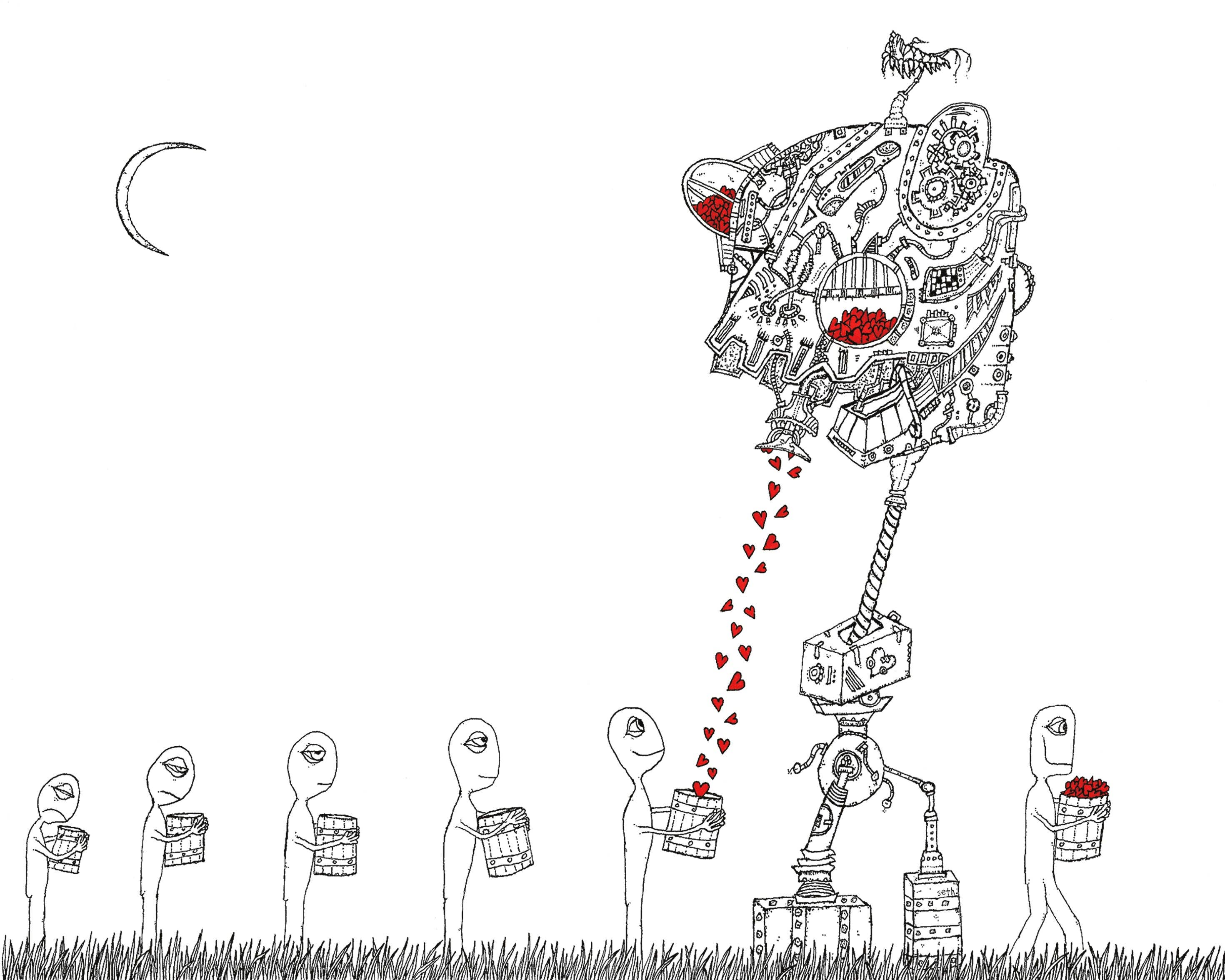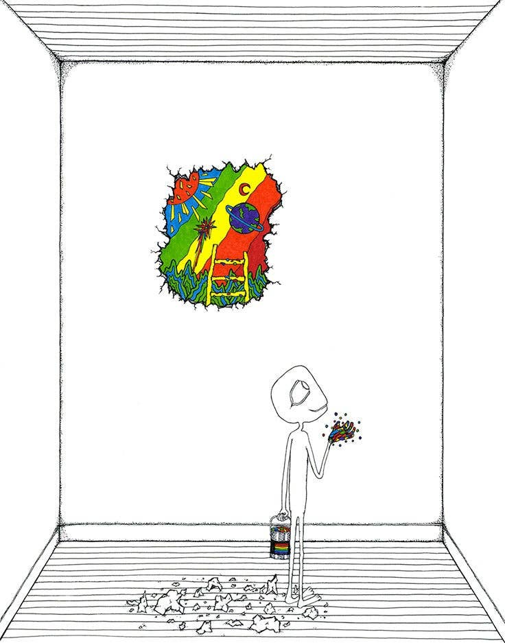 Ich lebe in der winzigen Stadt in den Bergen, die Thomas heißt und die meine Lieblingsstadt im gesamten Universum ist. Dort habe ich eine eigene Galerie namens Creature und ein Studio in Invisible, eine kollaborative Galerie und einen Arbeitsbereich die Straße runter. Thomas befindet sich in dem, was viele Leute West Virginia nennen, das sich in den Vereinigten Staaten befindet und von einigen sehr verwirrten Menschen geschaffen wurde, die imaginäre Linien über eine Landmasse zeichnen, die sie auch Nordamerika genannt hatten, auf einem Planeten namens Erde, einem Felsen in einem Universum, das niemand wirklich versteht. Ein Großteil der Arbeit, die ich mache, besteht im Kern darin, völlig vom großen Universum verwirrt zu sein, das niemand wirklich versteht. Ich bin nicht lähmend verwirrt, sondern auf eine Art und Weise, wie wir einfach weiter Knöpfe drücken und sehen, was passiert. Ich drücke viele Knöpfe und es wird immer interessanter. Ich habe beschlossen, dass ich fest davon überzeugt bin, dass all diese Arbeit, die Sie hier sehen, und all die Arbeit, die ich jemals machen werde, eine große Teamleistung ist.