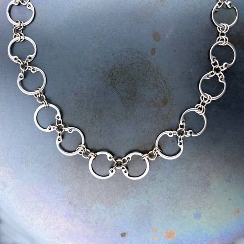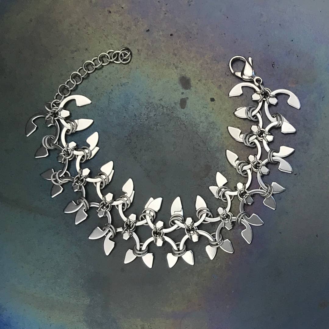 Designer/Maker Kelly Jones von Wraptillion kreiert polierten modernen Schmuck, der klassisch und dennoch kantig ist. Schauen Sie genauer hin - es besteht aus Edelstahlbeschlägen, die in Autogetrieben, Flugzeughydraulik, Motorradnaben und mehr verwendet werden. Die komplizierten Muster werden mit Titangliedern, Chainmaill-Techniken, Geduld und etwas kreativem Engineering erstellt. Diese leichten Designs sind Favoriten bei Männern, die Geschenke kaufen, und Frauen, die etwas Auffallendes und dennoch einfach zu tragen wollen. Von klassischen verbundenen Kreisen bis hin zu üppigen abstrakten Blumen macht Kelly jedes Stück in ihrem Studio in der Nähe von Seattle, Washington, von Hand.