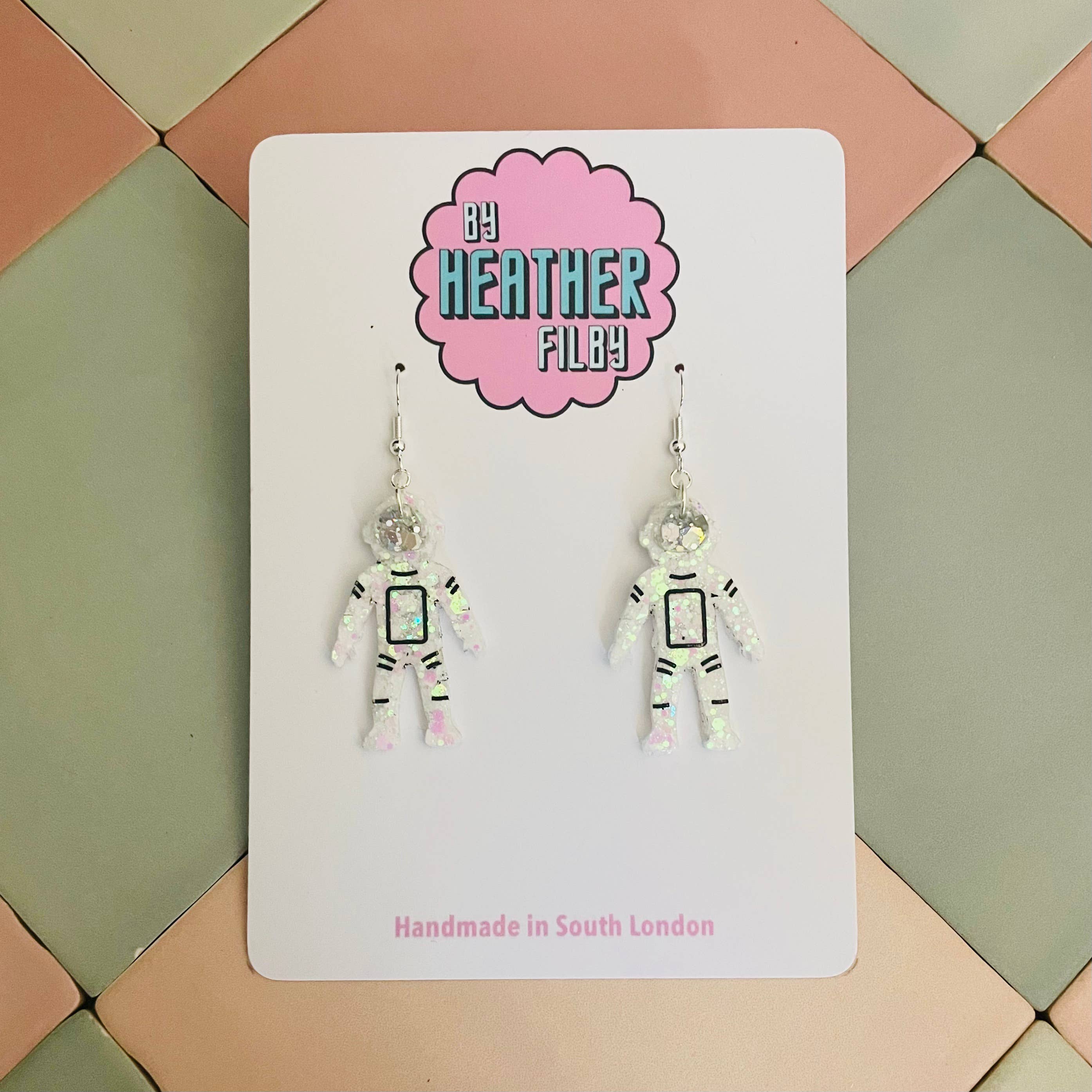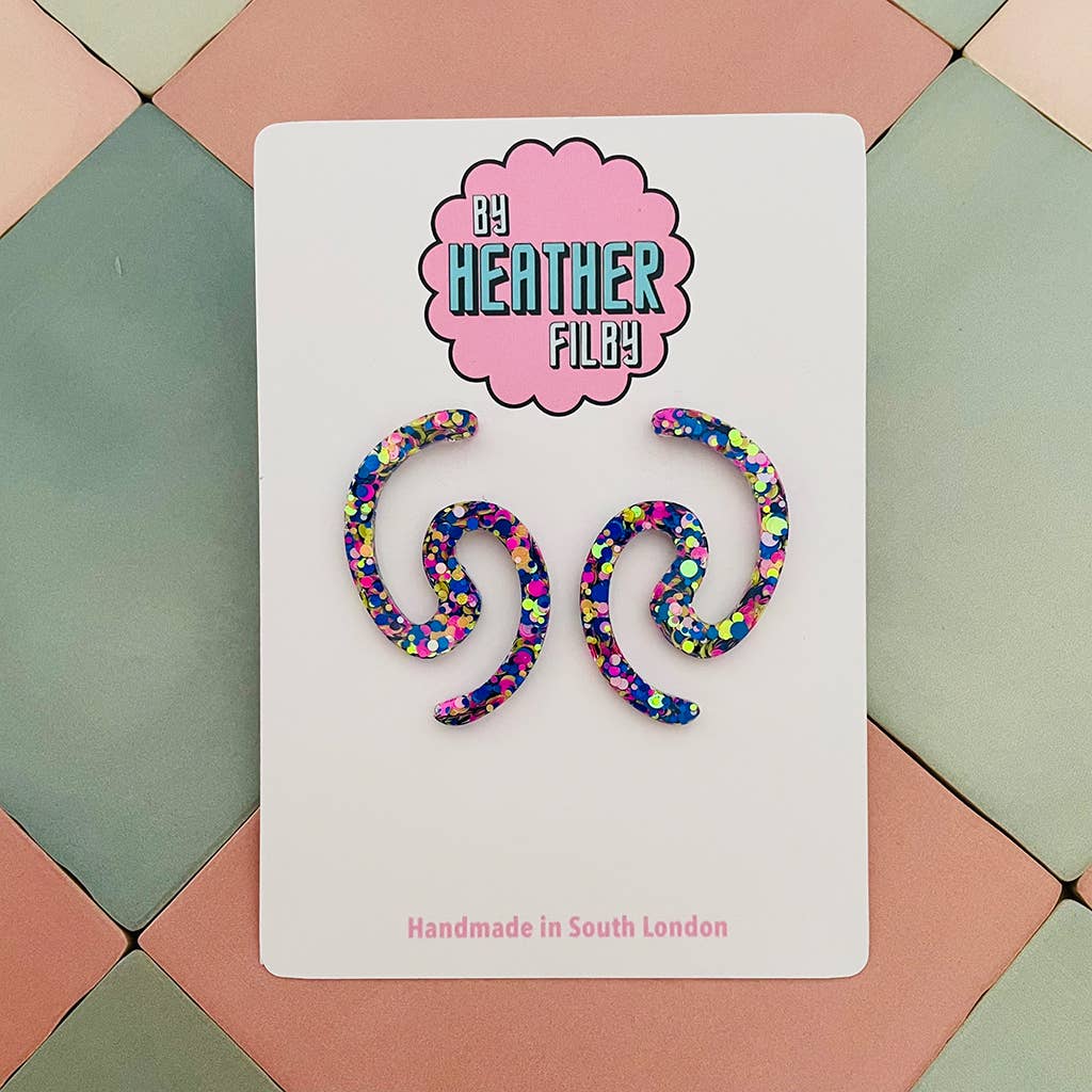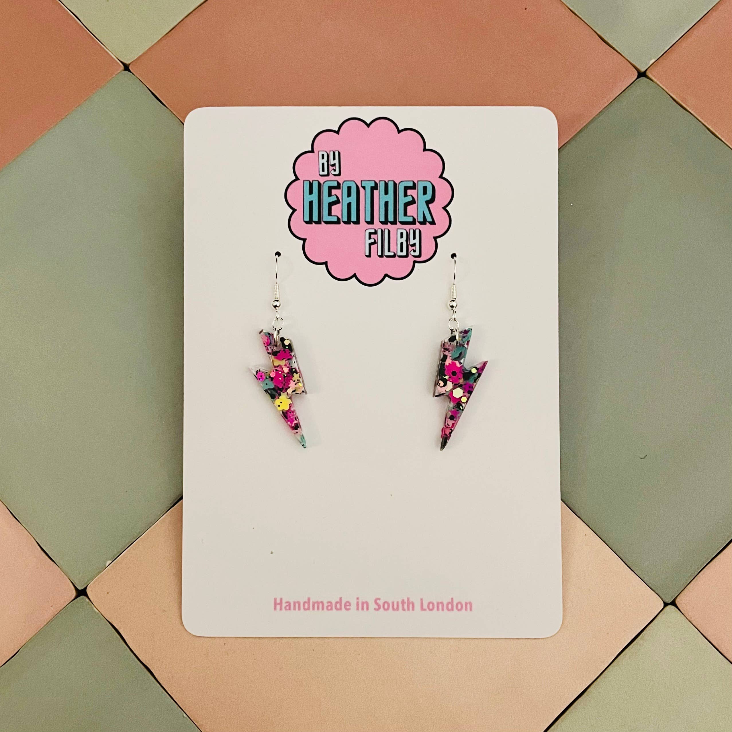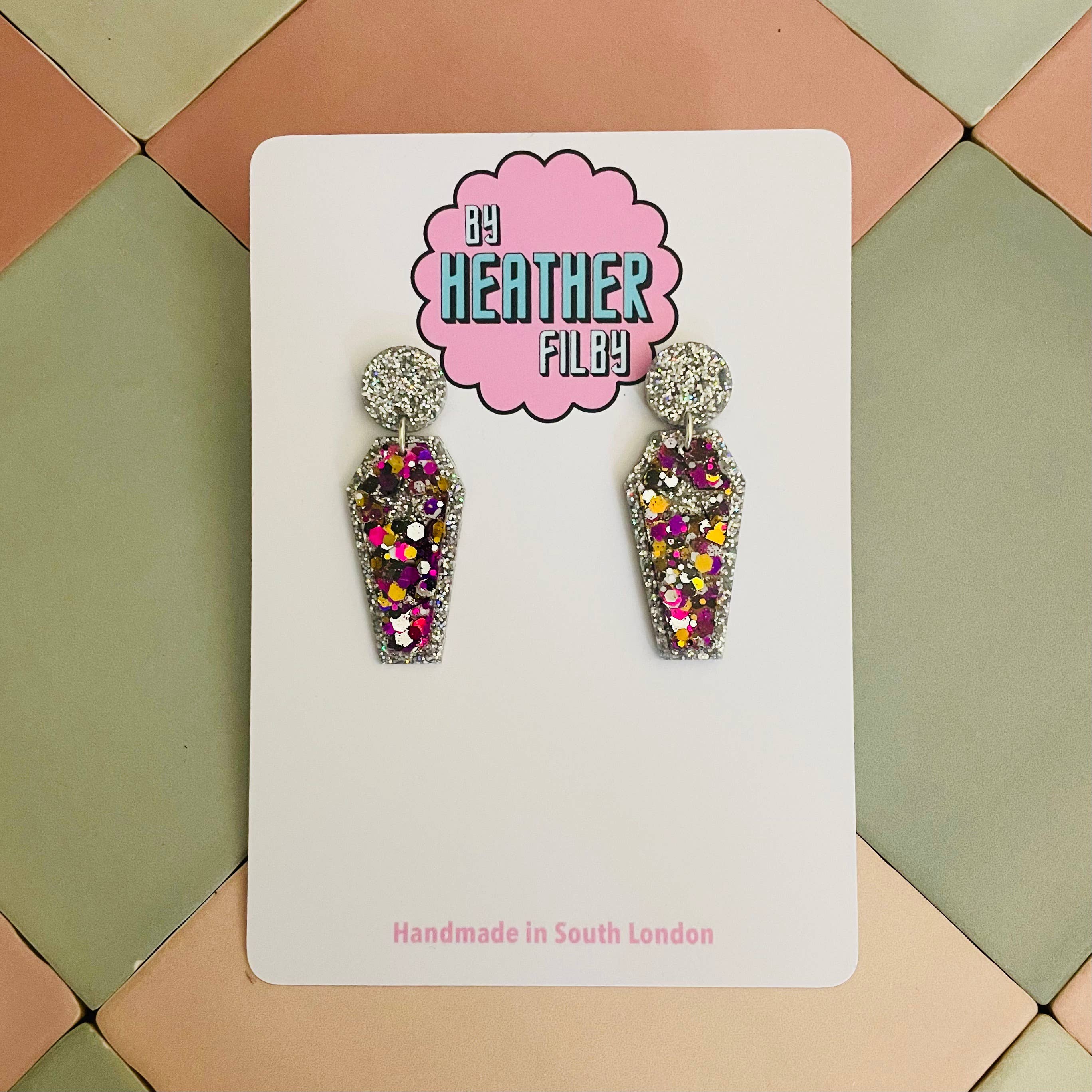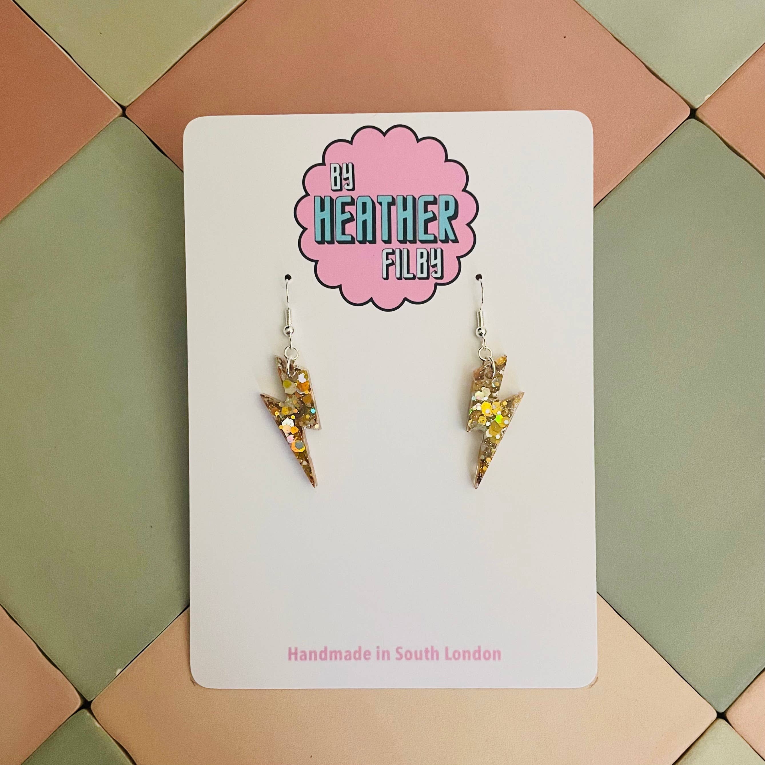 Hallo, ich bin Heather 👋 Gründerin, Designerin und Vollzeit-Glitzer-Enthusiastin hinter By Heather Filby. Was als kleines Lockdown-Experiment begann, hat sich zu meinem Vollzeitjob entwickelt, fünf Jahre später, und ehrlich gesagt zu einer Karriere, von der ich nicht einmal wusste, dass ich sie mir wünsche. Ich mache skurrilen, verspielten Statement-Schmuck und Haaraccessoires aus Harz – das Leben ist zu kurz für langweilige Ohrringe, oder? Ich habe es schon immer geliebt, meine Persönlichkeit durch Kleidung und Accessoires zu zeigen, und ich bin ein großer Fan von Statement-Ohrringen. Aber großer Schmuck ist oft schwer und unbequem. Hier kommt Harz ins Spiel: laute, lustige, glitzernde Stücke, die leicht sind (keine hängenden Ohrläppchen hier!). Jedes Stück wird von mir in meinem Studio in Süd-London entworfen und handgefertigt. Ich verbringe meine Tage damit, neue Designs zu erträumen, mit Farben zu experimentieren und Glitzer in Wohltätigkeitsläden, auf eBay oder überall dort zu suchen, wo ich ihn finden kann.