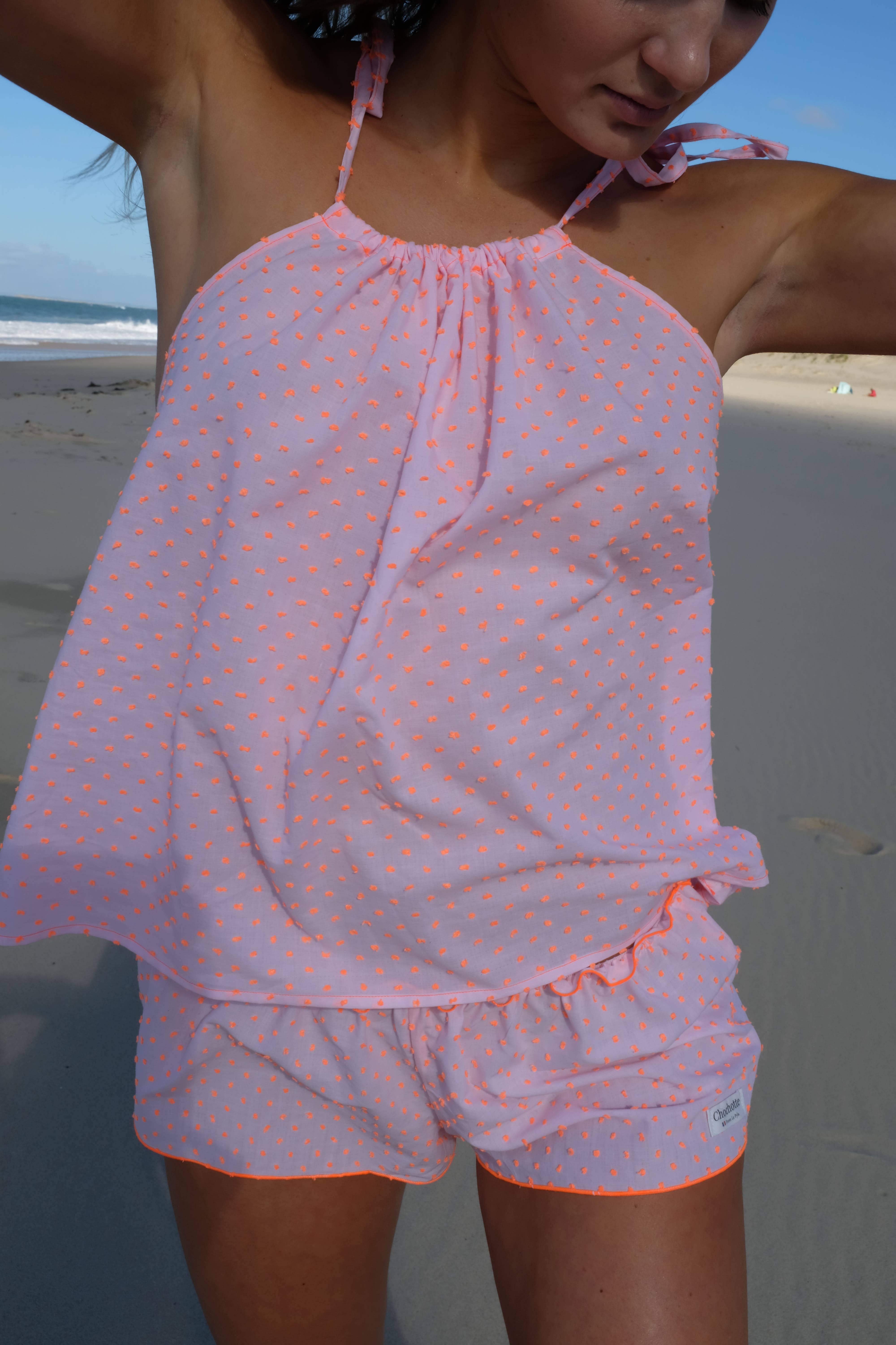 Hallo alle zusammen! Hier stelle ich mich vor, ich heiße Sandy. Ich komme ursprünglich aus Paris und habe in einem prestigeträchtigen Haus namens Maison Saint Laurent als Produktmanager und Projektmanager gearbeitet. Im Alter von 40 Jahren beschloss ich, mein Leben zu ändern und mich in einer Region niederzulassen, die mir besonders gefällt, nämlich dem Arcachon Basin. In Paris, während einer Zeit des Übergangs zwischen zwei Positionen, einer Veränderung des persönlichen Lebens, wollte ich meine Garderobe und auch meine Dessous erneuern. Ich wollte Dessous, die so aussehen wie ich: feminin, böhmisch und bequem in natürlichen Materialien. Mein erster Prototyp hat zwölf Stunden Arbeit gekostet! Ich musste mindestens zwanzig machen, bevor ich den richtigen gefunden habe. In meinem 35 m2 großen Pariser Studio entkam ich meinem Alltag und machte mein Höschen mit vielen verschiedenen Drucken, immer mit vielen Blumen und viel Frische. Es hat einfach Spaß gemacht! Mit der Ermutigung meiner Lieben begann ich das Abenteuer, mich selbst zu stellen. Ich habe das Sortiment jetzt erweitert, indem ich Bikinis im gleichen Slip anbiete. Eine kleine Anspielung auf meine Erinnerungen an einen Urlaub in der Bucht von Arcachon. Bis bald, Sandy