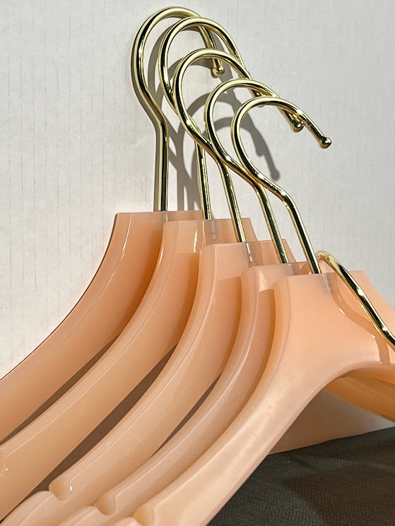 Die luxuriösesten Kleiderbügel der Welt! Unser Gründer ist der Meinung, dass die Kleiderbügel, an denen Sie Ihre Kleidung aufhängen, genauso aufregend und luxuriös sein sollten wie Ihre Kleidung! Also machte sie sich daran, die Handwarenbranche auf den Kopf zu stellen, Schrank (oder Regal) nach dem anderen! Unsere Kleiderbügel aus poliertem Lucite verändern das Spiel und verleihen jedem Kleiderschrank einen Hauch von Luxus. Jeder Aufhänger hat einen polierten, vergoldeten Haken, der sich zuverlässig um 360° drehen lässt, um den Look zu vervollständigen.