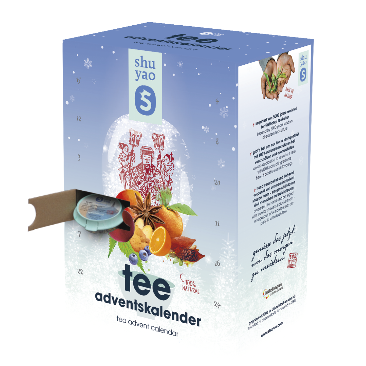 Zurück zur Natur mit Shuyao Tee - Trink 5000 Jahre Weisheit in einem Schluck Tee für zuhause & unterwegs to go mit grünem Gewissen #madeingermany: Schmeck den Unterschied ✔ ohne Teebeutel, Kapseln, Drops und Pappbecher! Spitzenzutaten im Tee sparen dem Planeten einen Haufen Müll, Co2 und Dir Geld - weil traditionelles mehrfach statt einfach Aufgiessen mehrfach spart. Wir sparen nur an einem nicht: authentischem Geschmack mit echten Nährstoffen aus der Natur Apotheke antiker Heillehren - in über 150 köstlichen Teesorten für Tee to go 🍃 mit nur 1-2 TL Tee (ca. 3g für 360ml) ❗ giesst du mehrfach Wasser über den Tag verteilt auf 💦egal ob heiss oder kalt coldbrew und trinkst bis zu 1,8l mit leckerer Abwechslung im Wasser. Was macht Shuyao Tee so einzigartig? Unser Tee ist nicht nur bio, sondern 100% naturrein : ✔ junges Blattfleisch statt geschredderte Stengel ✔ echte Fruchtqualität garantiert ohne Aromastoffe und Zusätze ✔ mit reinen Nährstoffen für Dein Wohlbefinden! No Greenwashing! Wir produzieren ausschließlich in Deutschland und investieren seit Gründung 2006 in nachwachsende Materialien wie unsere Aromadose aus Zuckerrohr! Mit Herz für gelebte Vielfalt ✔ als Unternehmerin profitiere ich nicht nur von der Vielfalt unserer Zutaten aus der ganzen Welt, sondern auch der Menschen im Shuyao Team! Die Einen nennen es inklusiv oder Diversity, wir nennen es Miteinander auf Augenhöhe - willkommen bei Shuyao! Nicola, Gründerin von Shuyao