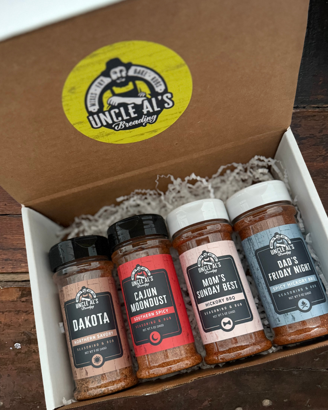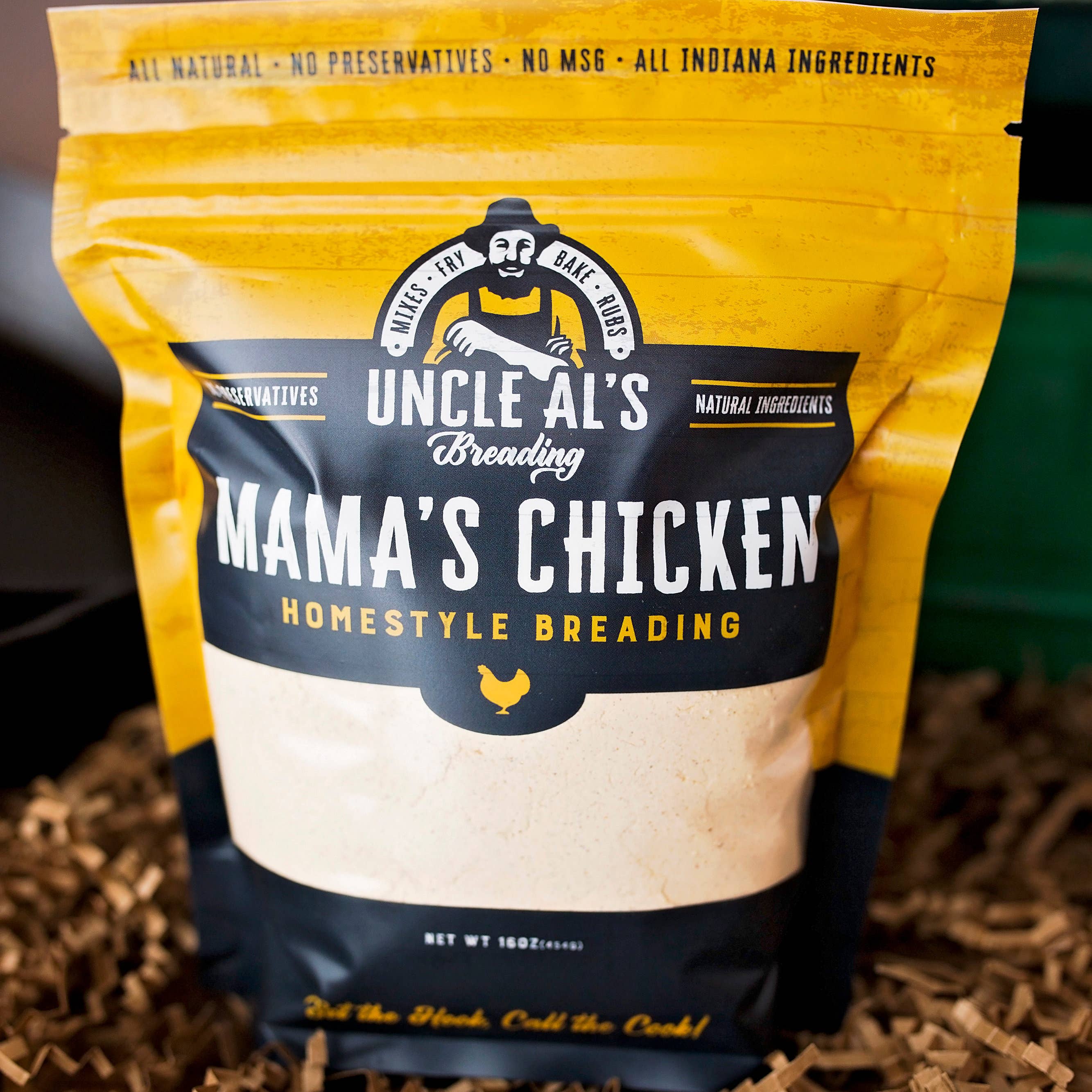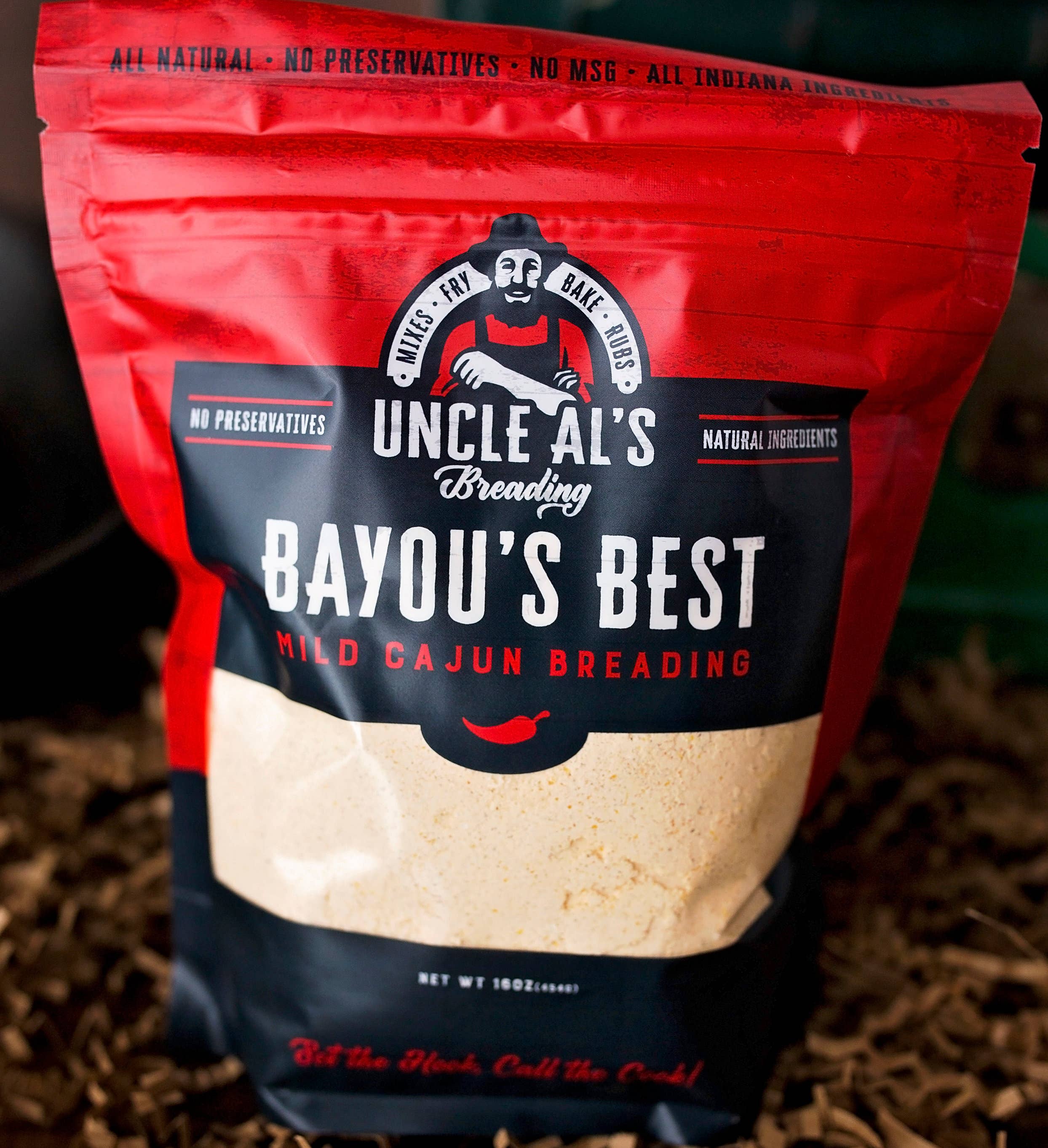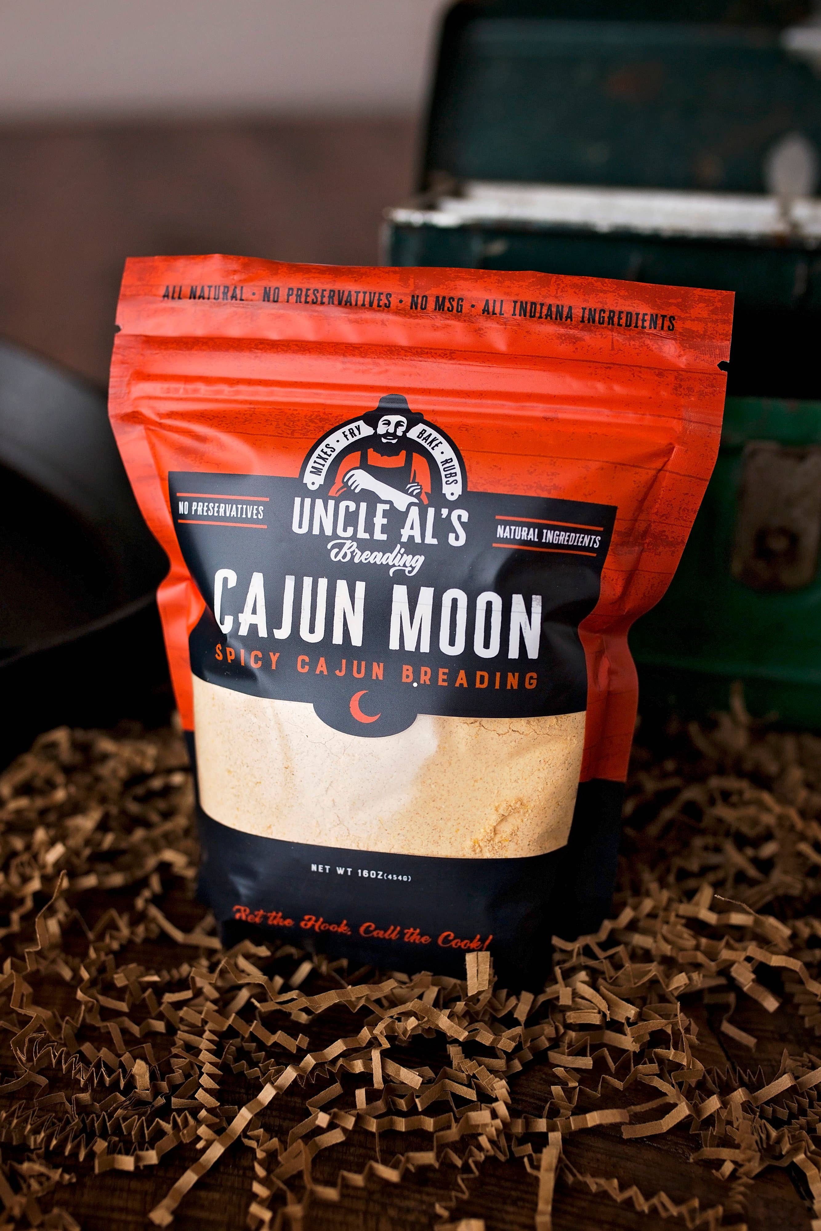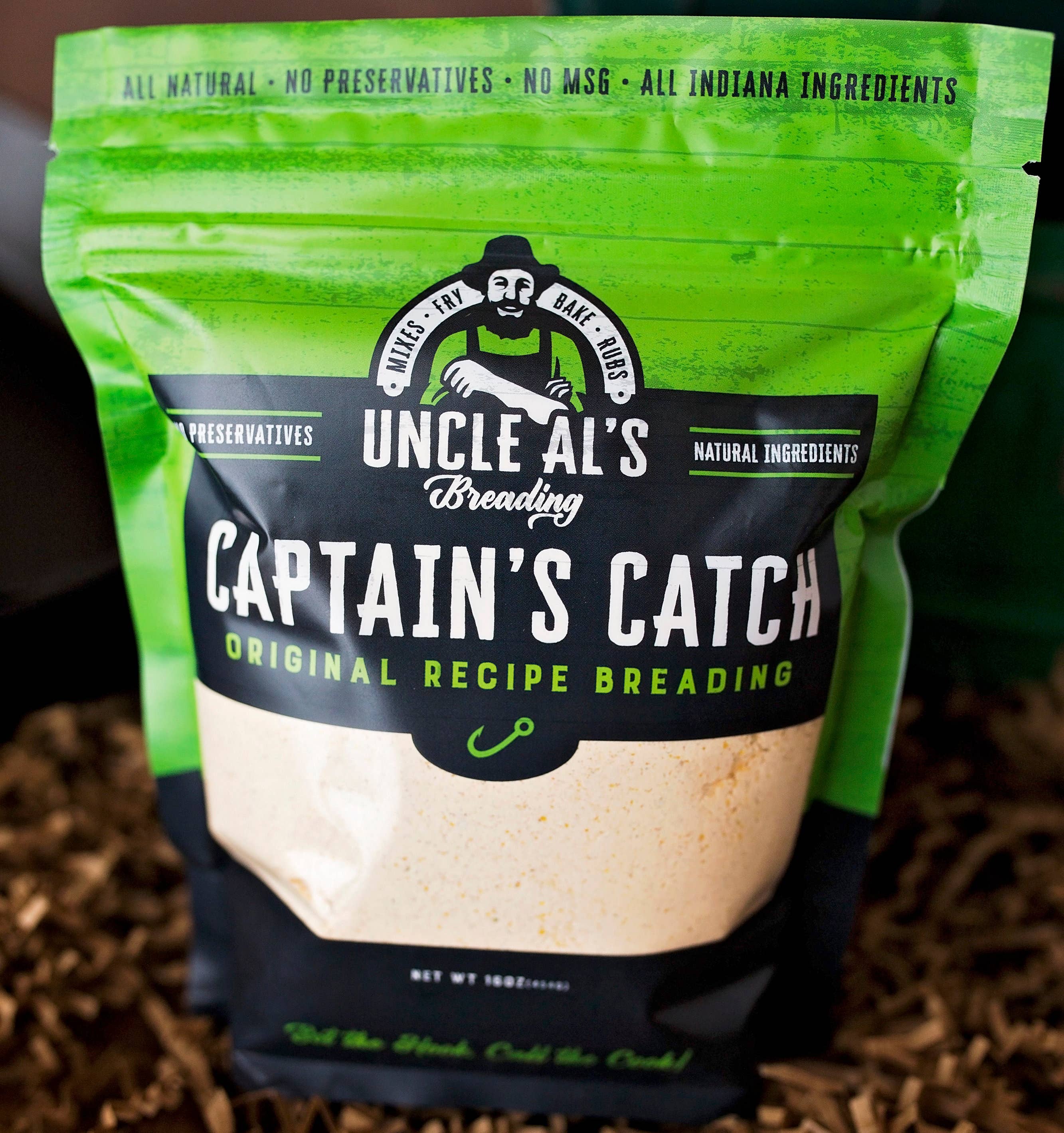 SETZ DEN HAKEN, RUF DEN KOCH Onkel Al's Preading ist seit Jahrzehnten ein gehütetes Geheimnis unter Fischern in Nord-Indiana und Michigan, um den Geschmack ihres täglichen Fangs zu verbessern. Heute wird Onkel Al's im Privatclub für Schweinefilets verwendet, im örtlichen Pub für panierte Hühnchen-Sandwiches und jetzt in der Küche Ihres Nachbarn, um das heutige Abendessen zuzubereiten. Uncle Al's verwendet hochwertige, lokale Zutaten ohne Konservierungsstoffe oder MSG. Das Mehl und der Mais werden vor Ort angebaut und gemahlen. Jede Charge wird im historischen Converse, Indiana, von einer stolzen Farmfamilie in Hoosier gemischt. Sie müssen nichts hinzufügen, der gesamte Geschmack ist bereits in der Tüte. Jede Sorte unserer gewürzten Paniermischungen kann gebacken, gebraten oder luftgebraten werden.