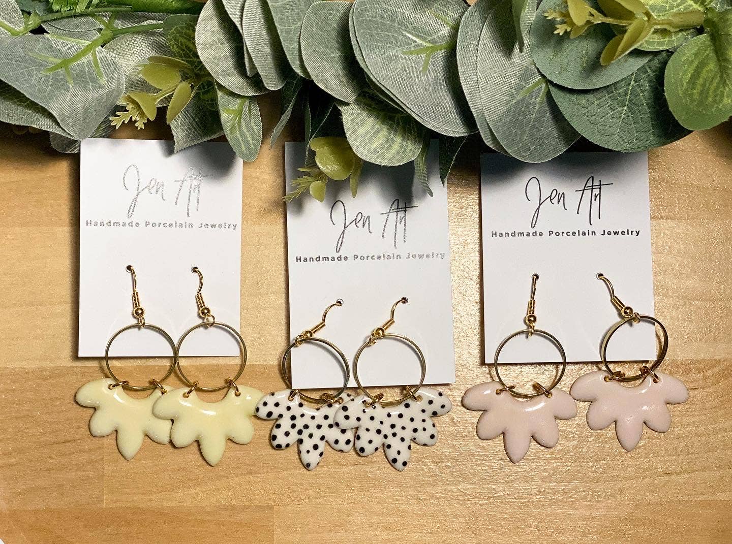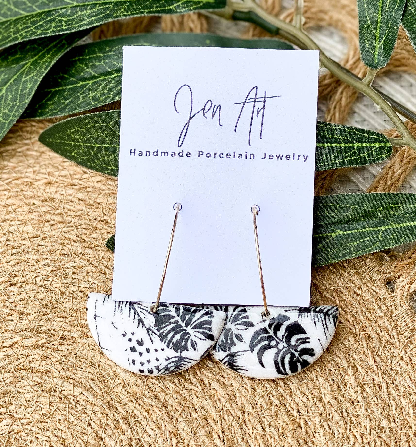 Ich stelle seit 2021 Porzellanschmuck her, daher bin ich neu als „Marke“, aber ich war mein ganzes Leben lang ein Hersteller aller kreativen Dinge mit Schwerpunkt auf Ton. Ich bin auch Keramiklehrerin an einer örtlichen High School. Ich arbeite seit mehr als 20 Jahren in Ton, daher sehe ich endlose Möglichkeiten für meine Arbeit. Mir wurde gesagt, dass man wirklich in der Lage sein muss, mein Produkt im echten Leben zu sehen und zu berühren, um zu erkennen, wie besonders es ist. Die Stücke sind aufgrund der Beschaffenheit des Porzellans extrem leicht. Die brillante hellweiße Farbe kontrastiert mit den schwarzen Mustern. Die Schwarz-, Weiß- und Goldpalette spricht Menschen an, da sie zu einer Vielzahl von Kleidungsstilen und Farben passen kann. Mein Ziel ist es, zeitlosen Schmuck zu kreieren, der täglich getragen werden kann und eine Vielzahl von Frauen anspricht. Ich mache jeden Porzellananhänger von Anfang bis Ende von Hand. Zunächst rolle ich Ton auf eine sehr dünne Platte aus und trage das Muster mit benutzerdefinierten Siebdrucken auf die Oberfläche des Tons auf.