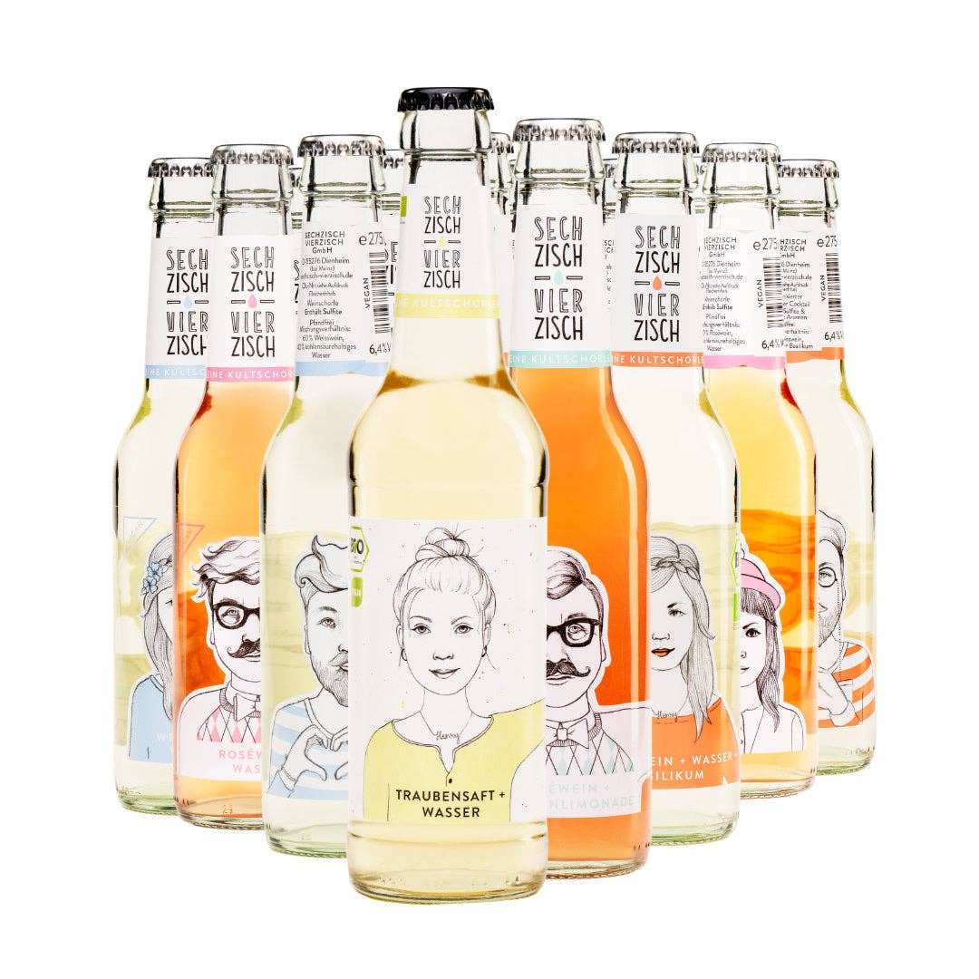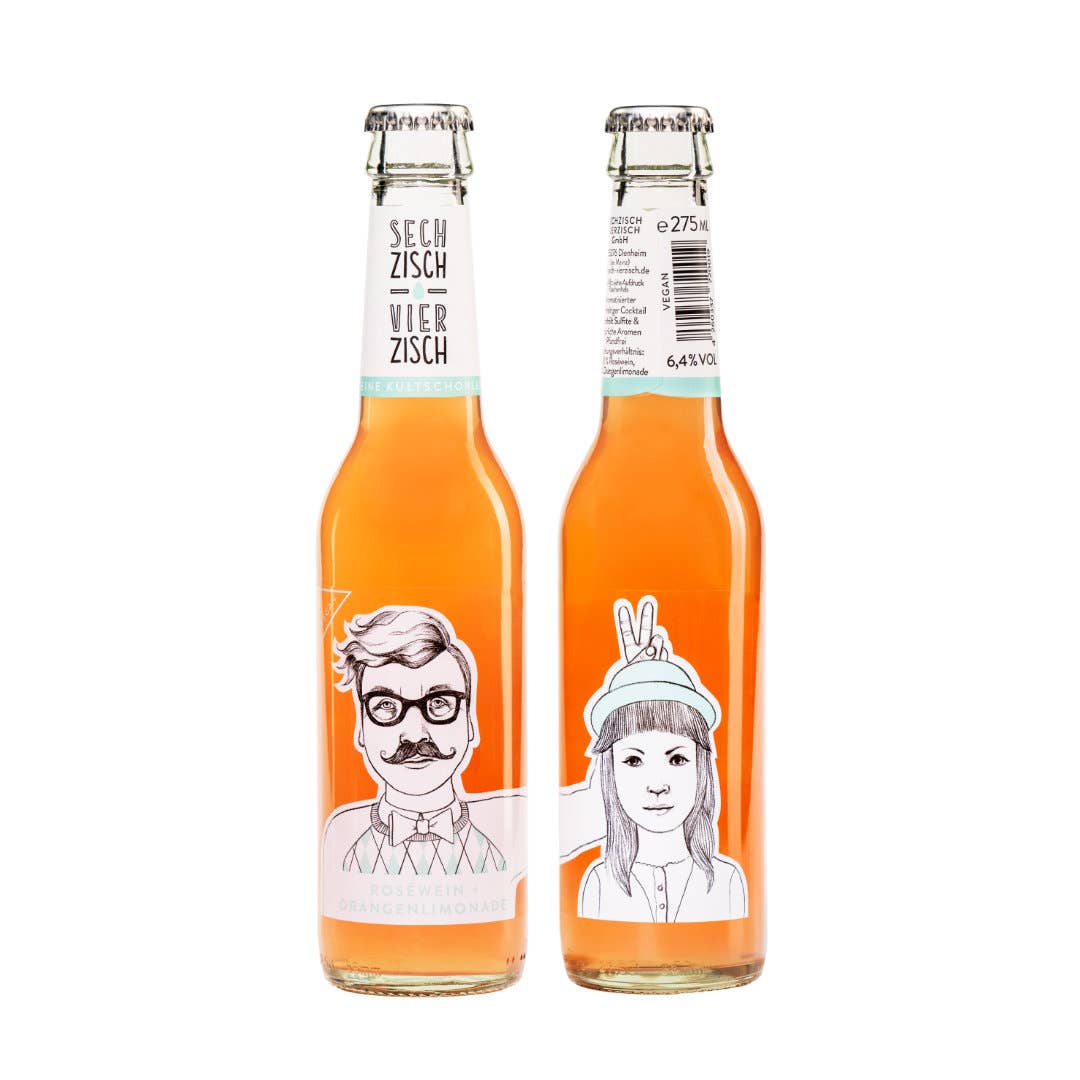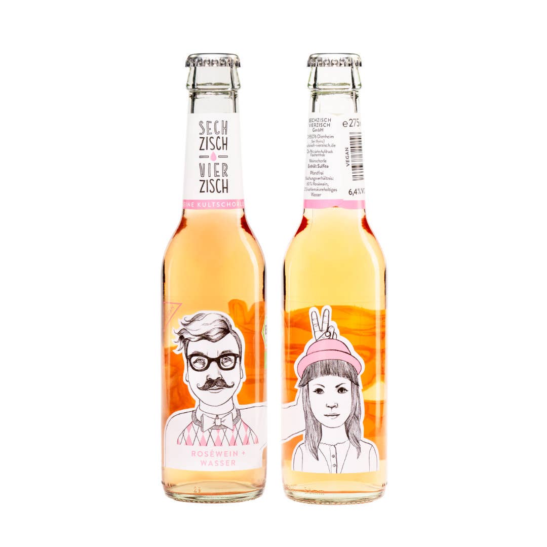 Die Idee zum ersten Produkt, einer Weinschorle, bestehend aus Roséwein und selbstgemachter Orangenlimonade (Kultgetränk in Rheinhessen), abgefüllt in Glasflaschen, kam Anna und Patrick im Jahr 2012 durch ihre Verbundenheit zu der Weinbauregion Rheinhessen mit ihren Besonderheiten und Bräuchen. Von Anfang an stand für die beiden Rheinhessen fest, dass sie ihr Produkt Sechzisch Vierzisch in den Kontext der regionalen Herkunft stellen wollten. Der auf dem Mischungsverhältnis basierende Produkt- und Markenname wurde deshalb in der Schreibweise der rheinhessischen Mundart verfasst, die auch in der Kommunikation rund um das Produkt immer wieder aufgegriffen wird. Neben dem Bezug zur Herkunftsregion und den sorgfältig ausgewählten regionalen BIO Weinen, spielt bei der Sechzisch Vierzisch GmbH das Flaschendesign rund um „Henry“ und „Lotte“ eine zentrale Rolle. Das Winzerpaar ziert als gedruckte Zeichnung die Flaschenetiketten der Weinschorlen. Das Design der Flaschenetiketten wurde im Jahr 2018 mit dem German Design Award ausgezeichnet.