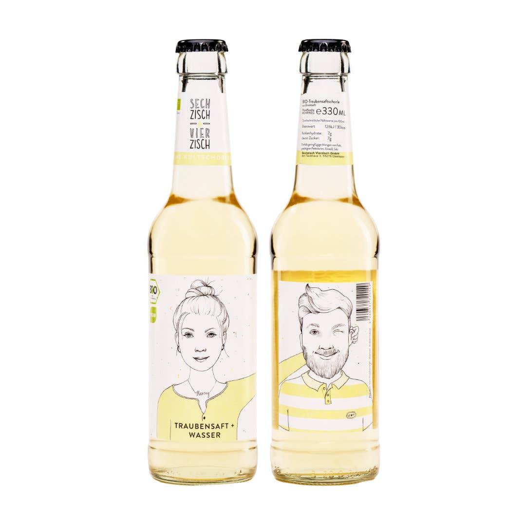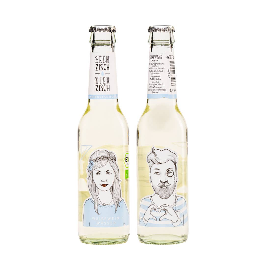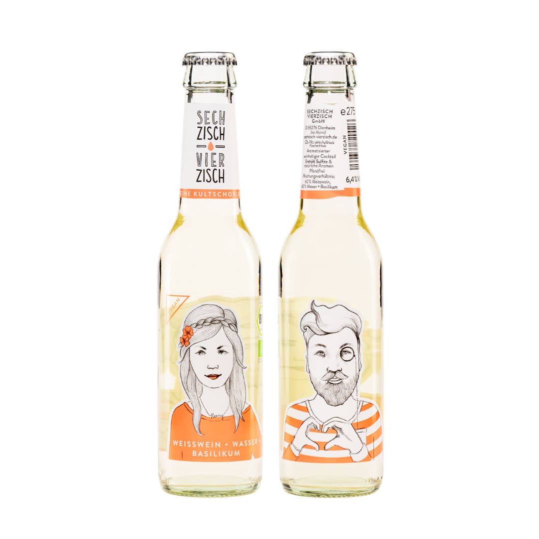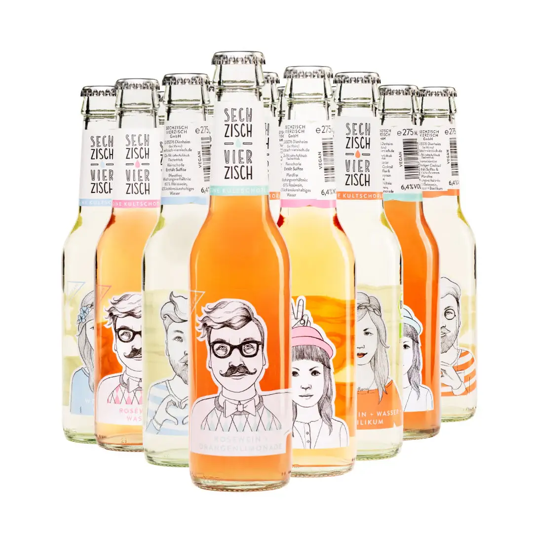 Die Idee zum ersten Produkt, einer Weinschorle, bestehend aus Roséwein und selbstgemachter Orangenlimonade (Kultgetränk in Rheinhessen), abgefüllt in Glasflaschen, kam Anna und Patrick im Jahr 2012 durch ihre Verbundenheit zu der Weinbauregion Rheinhessen mit ihren Besonderheiten und Bräuchen. Von Anfang an stand für die beiden Rheinhessen fest, dass sie ihr Produkt Sechzisch Vierzisch in den Kontext der regionalen Herkunft stellen wollten. Der auf dem Mischungsverhältnis basierende Produkt- und Markenname wurde deshalb in der Schreibweise der rheinhessischen Mundart verfasst, die auch in der Kommunikation rund um das Produkt immer wieder aufgegriffen wird. Neben dem Bezug zur Herkunftsregion und den sorgfältig ausgewählten regionalen BIO Weinen, spielt bei der Sechzisch Vierzisch GmbH das Flaschendesign rund um „Henry“ und „Lotte“ eine zentrale Rolle. Das Winzerpaar ziert als gedruckte Zeichnung die Flaschenetiketten der Weinschorlen. Das Design der Flaschenetiketten wurde im Jahr 2018 mit dem German Design Award ausgezeichnet.