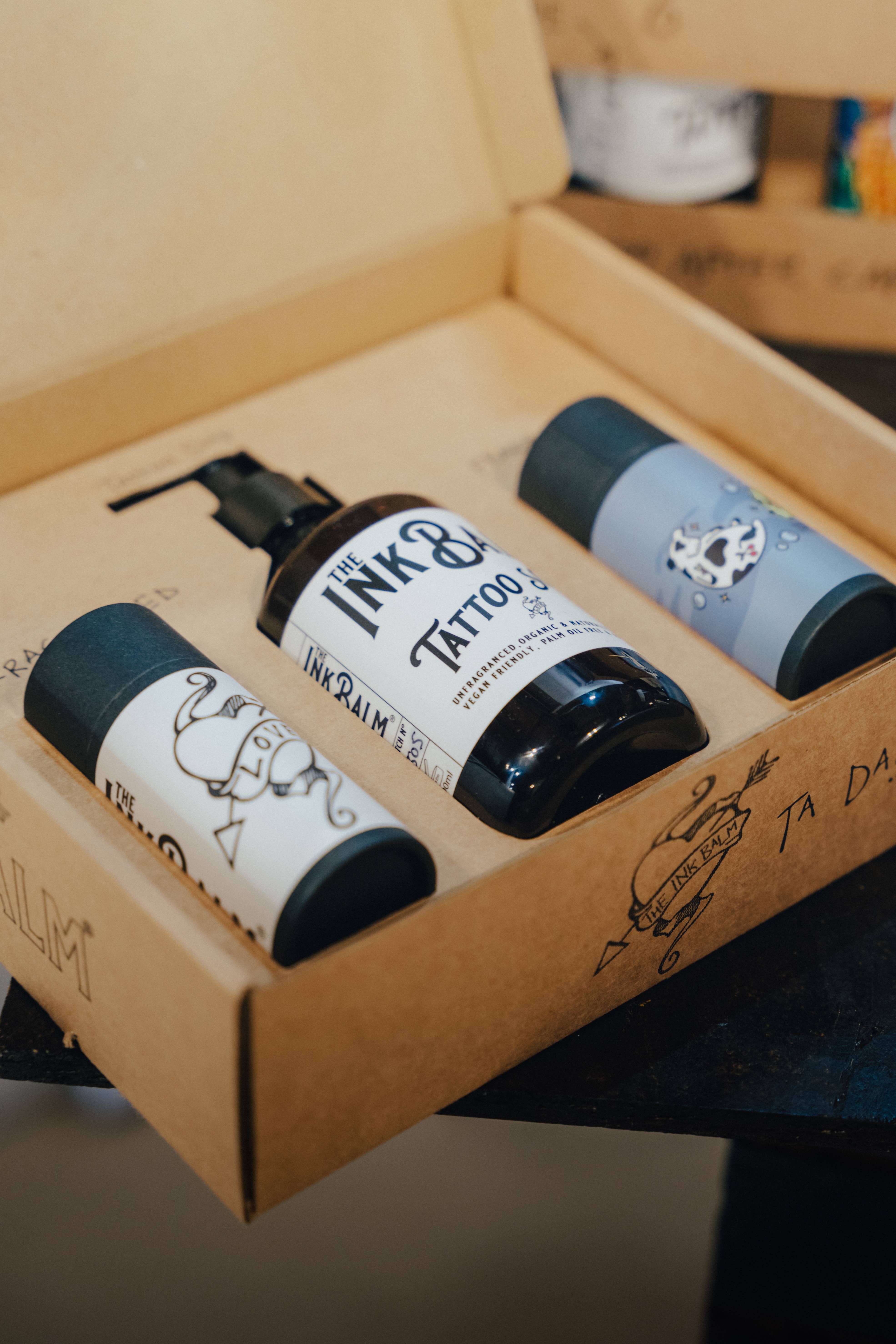 Fiona ist eine schottische Hautpflege-Guru, die eine Marktlücke für schöne, vegane, natürliche Produkte für tätowierte Haut entdeckt hat. Der Ink Balm ist ein Stick aus veganen Ölen und Butter, der Ihre Haut nach der Tätowierung und für immer nährt und pflegt. Die Öko-Tube aus Karton ist mit schönen, von Tattoo-Kunst inspirierten Etiketten verziert. Durch die Zusammenarbeit mit Tätowierern sind in den Tintenbalsamkartons viele verschiedene Stile vertreten. Die vegane Butter ist mit ätherischen Ölen angereichert, die antibakterielle und entzündungshemmende Eigenschaften haben, der Haut helfen, zu heilen und die Designs strahlend und definiert zu halten. Wir haben eine Mini-Version von The Ink Balm entwickelt, damit Ihre Kunden das Produkt ausprobieren können oder Ihre Kunden sich selbst etwas gönnen können Diese leckeren Butters lieben deine Tattoos - PS Sie können auch von jedem mit Haut verwendet werden!