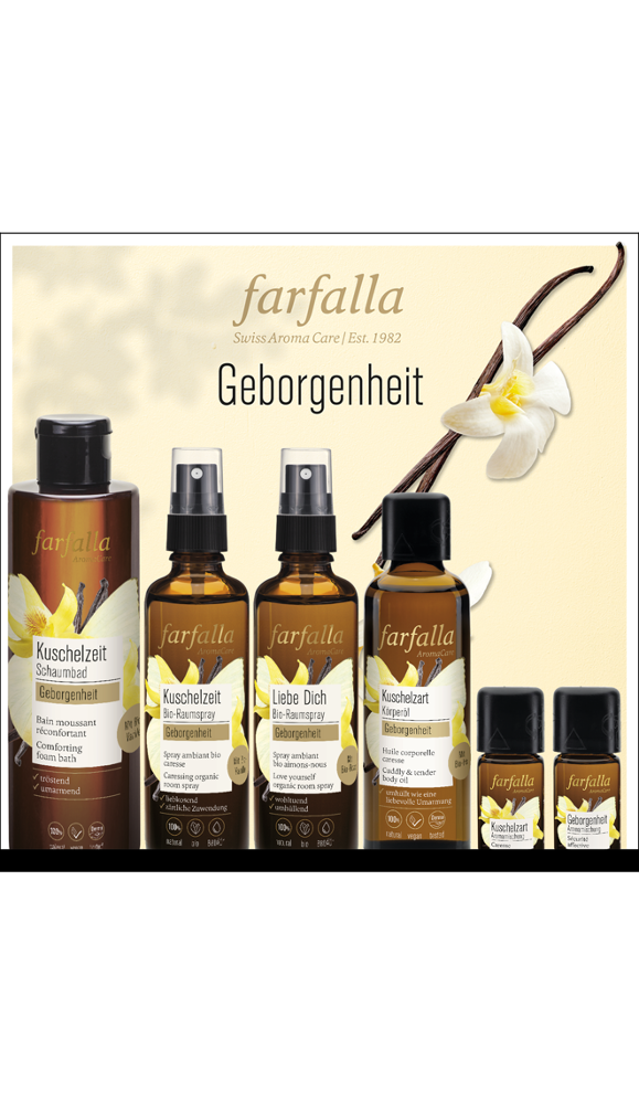 Beflügle dein Wohlbefinden mit farfalla. farfalla ist Wellbeing. Ganzheitlich und nachhaltig. Auf der Basis biologisch gewonnener und in der Schweiz verarbeiteter, 100 % natürlicher ätherischer Öle kreiert farfalla eine Fülle von Naturkosmetik-, Pflege- und Wellbeing-Produkten, die uns täglich neu beflügeln. Die Kraft der Aromapflanze steckt in jedem einzelnen Produkt. ->100 % natürlich: höchstmöglicher Anteil an Bio-Rohstoffen(kontrolliert biologischer Anbau) 0 % Synthetik, Nano oder GMO ->Fairer Handel: langjährige Lieferantenbeziehungen und Anbauprojekte mit Abnahmegarantien und sozialem Mehrwert ->Nachhaltigkeit: CO2 neutral, nachhaltige Verpackungen, klimaneutraler Versand, soziale Projekte ->Tierwohl: tierversuchsfrei, vegan ->Unternehmen: Familiengeführt in 2. Generation, konzernfrei ->Zertifizierungen: zertifiziert nachhaltiges Unternehmen (CSE), zertifizierte Bio- / Naturkosmetik Natrue Unser Know-how für höchste Qualität • Pioniere der Naturkosmetik mit In-House Entwicklungserfahrung seit vier Jahrzehnten • Gelebtes Aromatherapiewissen durch die langjährige Zusammenarbeit mit über 700 Spitälern • Herstellung in den eigenen Schweizer ISO-zertifizierten Produktionsstätten in Uster und im Jura • Wir unterstützen Hilfsprojekte zur Geburtshilfe in Afrika und Europa. Für einen gesunden Start ins Leben.
