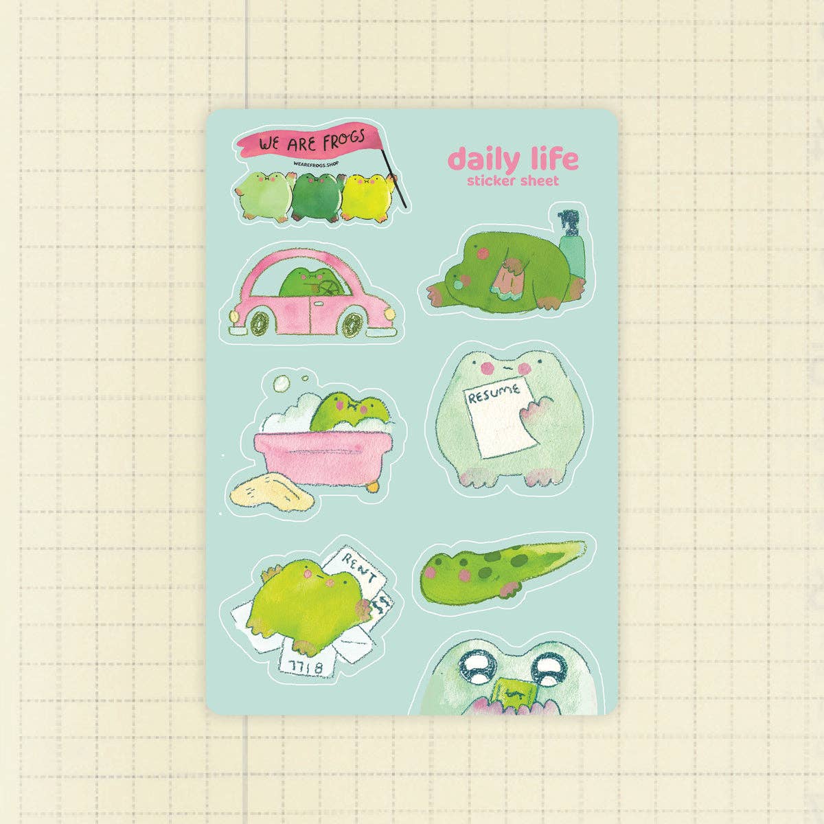 We Are Frogs ist eine unabhängige Marke, die sich um die Abenteuer von drei außerirdischen Froschbrüdern (Boof, Pudge und Wirt) von einem Planeten namens Frogworld dreht. Nachdem sie auf der Erde abgestürzt sind, tun sie ihr Bestes, um das Chaos von Jobs, Miete, Freundschaft und Selbstfürsorge zu überleben. Wir wurden in großen Einzelhandelsgeschäften wie Hot Topic und BoxLunch sowie in vielen unabhängigen Geschäften im ganzen Land vorgestellt. Unsere Produkte kombinieren alberne, charaktergetriebene Designs mit gemütlichen, von der Natur inspirierten Ästhetiken - perfekt für Kunden, die Persönlichkeit, Humor und einen Hauch von Laune lieben. Von Vinylaufklebern und Journaling-Artikeln bis hin zu Blind Bags und magnetischen Lesezeichen wird jedes Produkt geschaffen, um Freude zu bereiten und sammelwürdig zu wirken! Unsere Produkte werden in unserem professionellen Druckstudio in Kalifornien entworfen und produziert. Wir sind stolz darauf, vollständig zollfrei, lieferkettenstabil und vollständig künstlerisch geführt und betrieben zu sein. Unser Ziel ist es, Einzelhändlern das Bestücken von verspielten, gut gemachten Produkten so einfach wie möglich zu machen - mit niedrigen Mindestbestellmengen, flexiblen Umtauschoptionen und schneller, zuverlässiger Erfüllung.