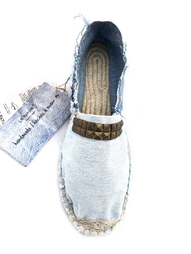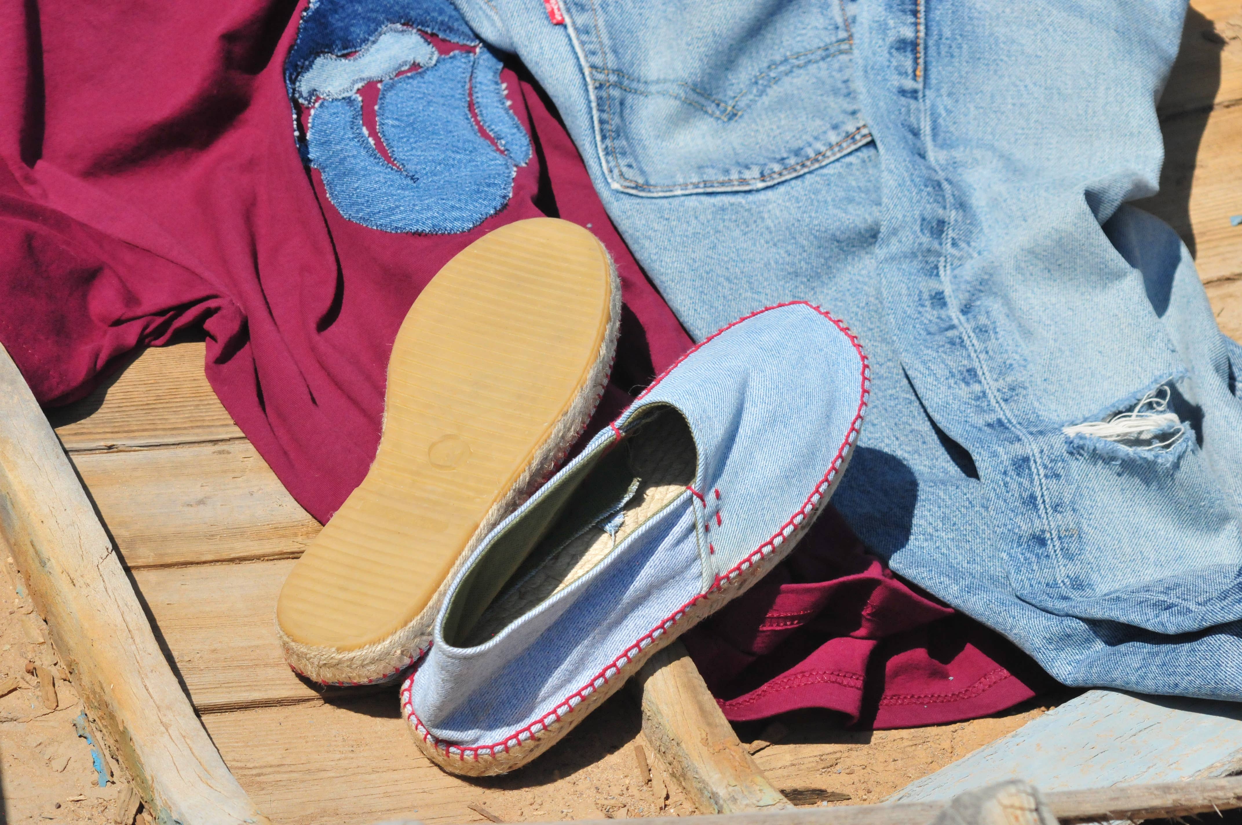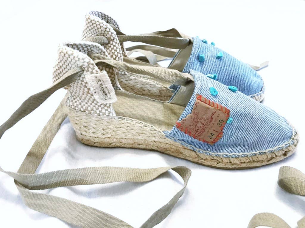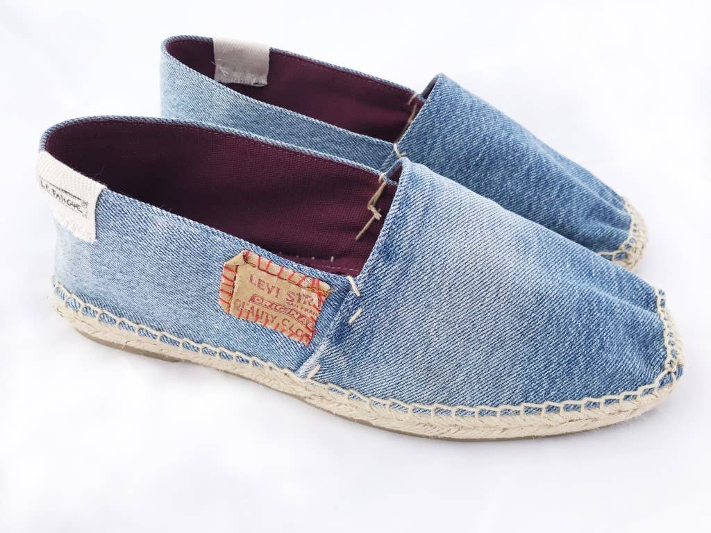 Handgemachte Espadrilles und Levi's Vintage-Remake. Einzigartige handgefertigte Stücke. Die authentischen und originalen Espadrilles oder Espadrilles, der antike Begriff Espardenya, werden seit dem 13. Jahrhundert in Spanien und Frankreich handgefertigt und sollen ägyptischen Ursprungs sein. Ihre authentische Verpackung ist eine uralte Kunst, die im Zuge der Globalisierung fast verschwunden ist. SLINGS werden nach dieser Tradition hergestellt, von erfahrenen Handwerkern von Hand geschnitten und genäht und aus hochwertigen Materialien hergestellt, um ihre Handwerkskunst zu verbessern und die Umwelt zu schonen. Sie haben eine Mischung aus Kultur, Geschichte und spanischem Stil, die mit dem italienischen Stil ihrer Designer verschmilzt. Für diese Espadilla-Linie „DENIM LEVI'S VINTAGE RECYCLED“, die aus der Leidenschaft für den ikonischen zeitlosen Schuh und aus dem Stil der ebenfalls zeitlosen Vintage-Jeans von Levi's Denim entstanden ist, werden Levi's recycelte Jeanshosen verwendet, die ausschließlich „vintage“ sind und dank ihrer Alterung im Laufe der Zeit einen einzigartigen und unverwechselbaren Geschmack bieten. Jede amerikanische Vintage-Bluejeans von Levi's hat ihre eigene Geschichte und jedes Paar „LE FANGHE“ -Espadrilles trägt sie mit sich.