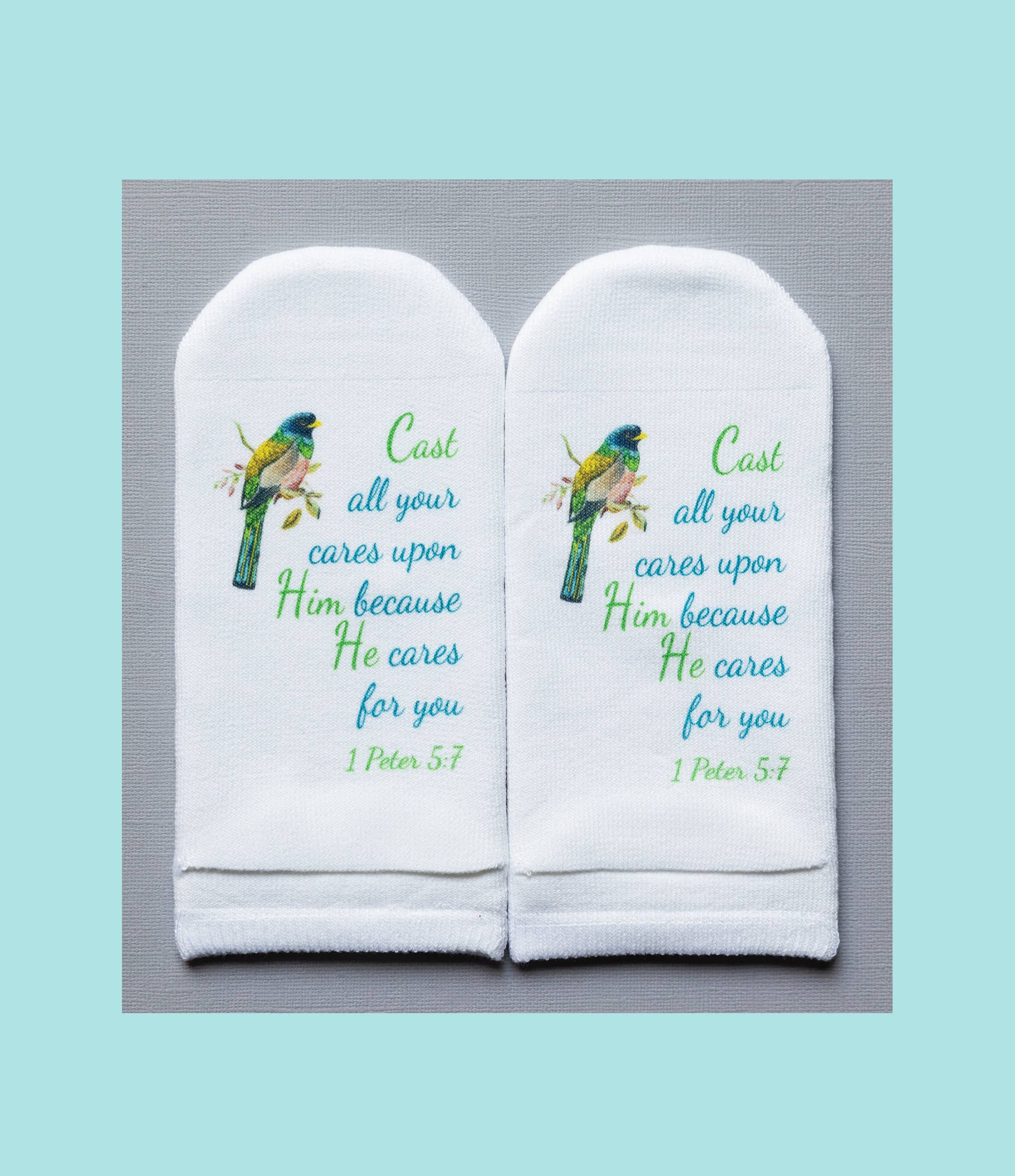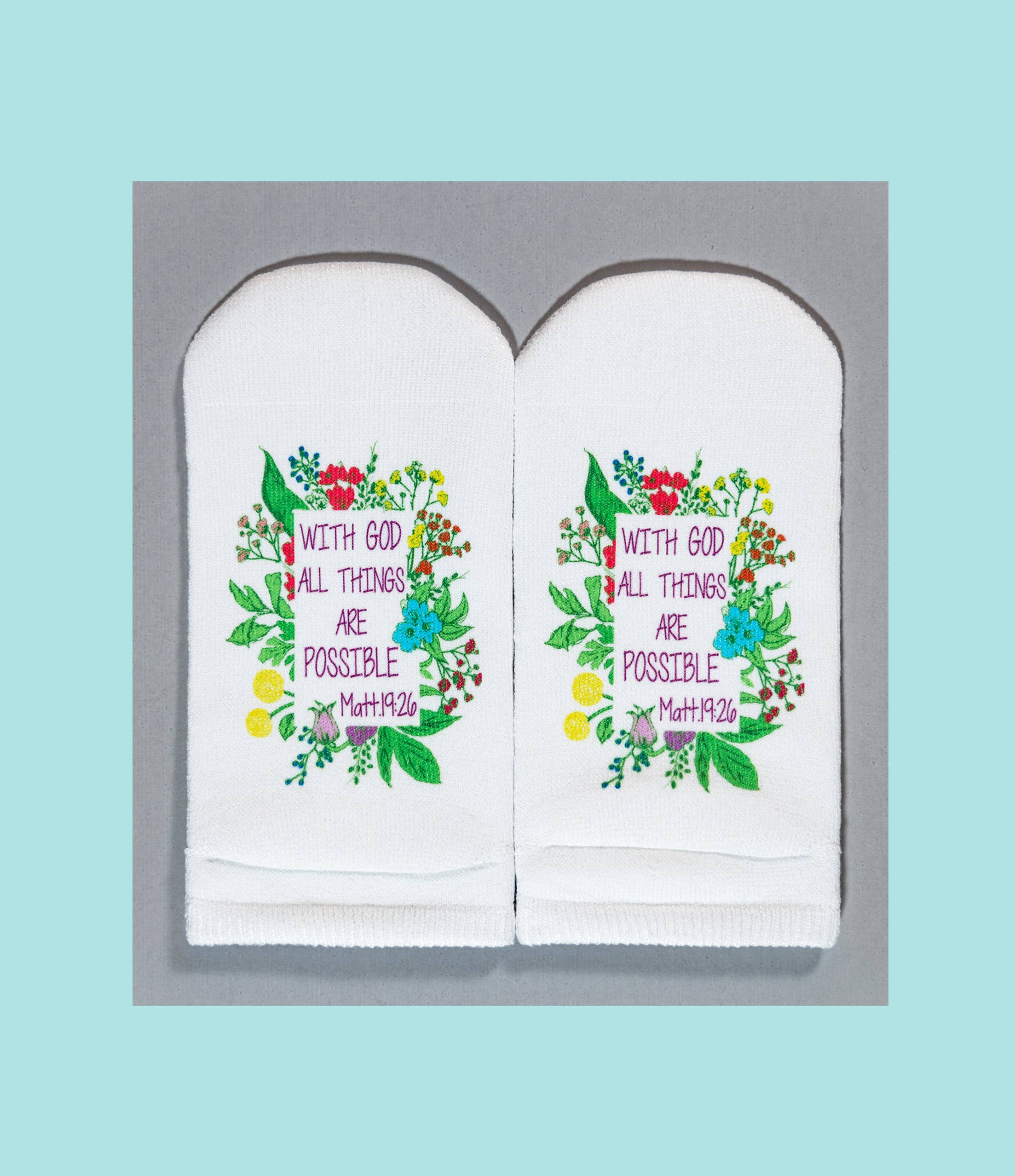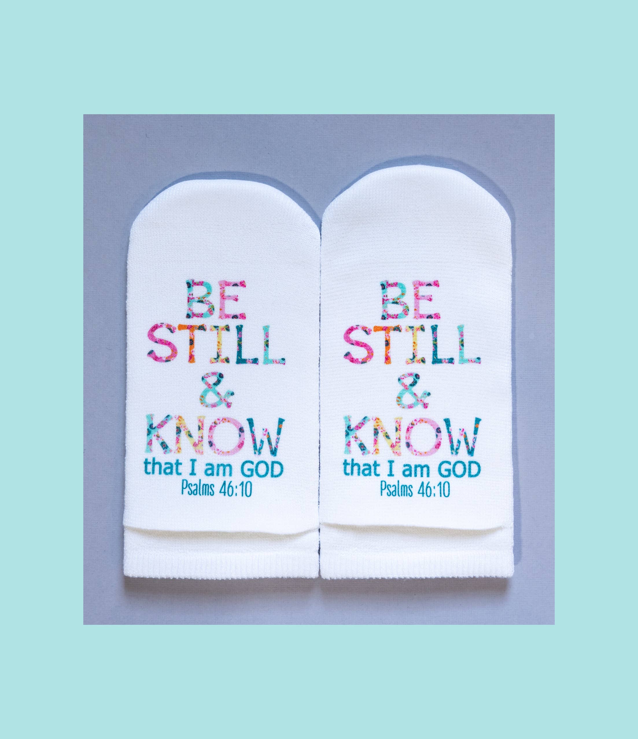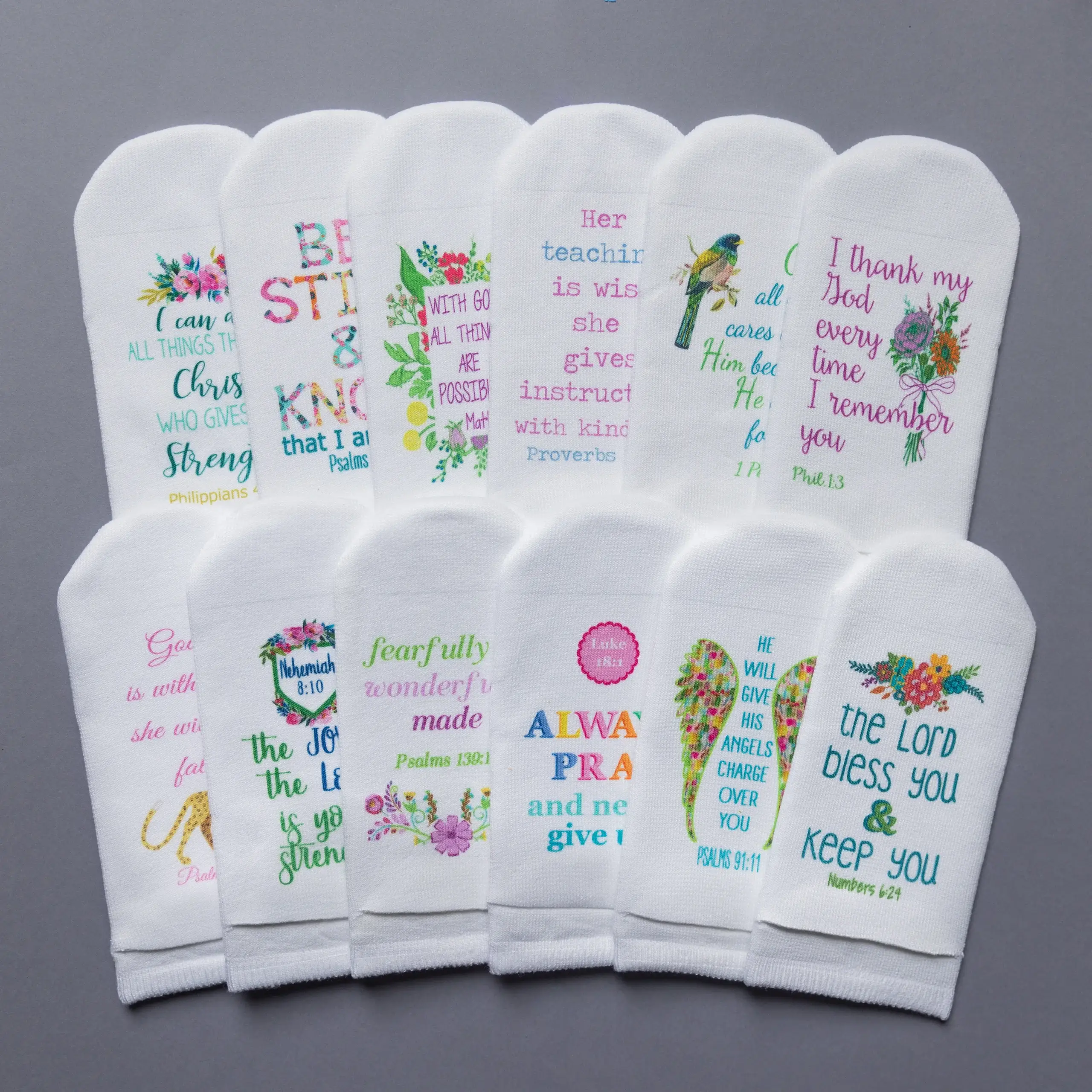 Mit einer Leidenschaft für Kreativität und Gottes Wort betrachtete ich eine Socke und fragte Gott: „Wie lege ich einen Vers auf eine Socke?“ Sobald die Idee kam, rief ich meine Freundin Jill an und sagte: „Klingt das verrückt: Was wäre, wenn ich den Vers auf den Boden legen würde und überall, wo du den ganzen Tag hingehst, würdest du auf dem Wort stehen!“