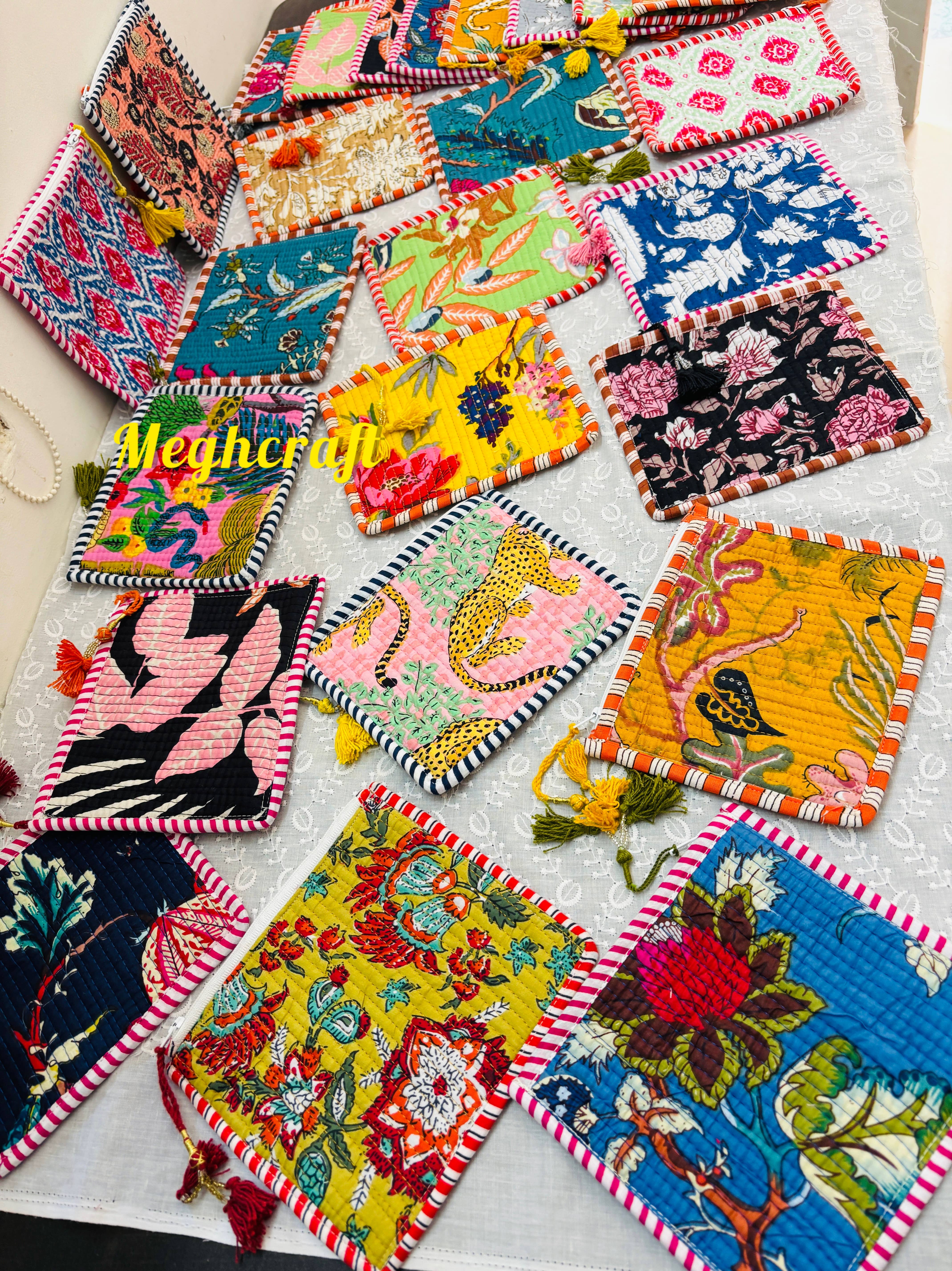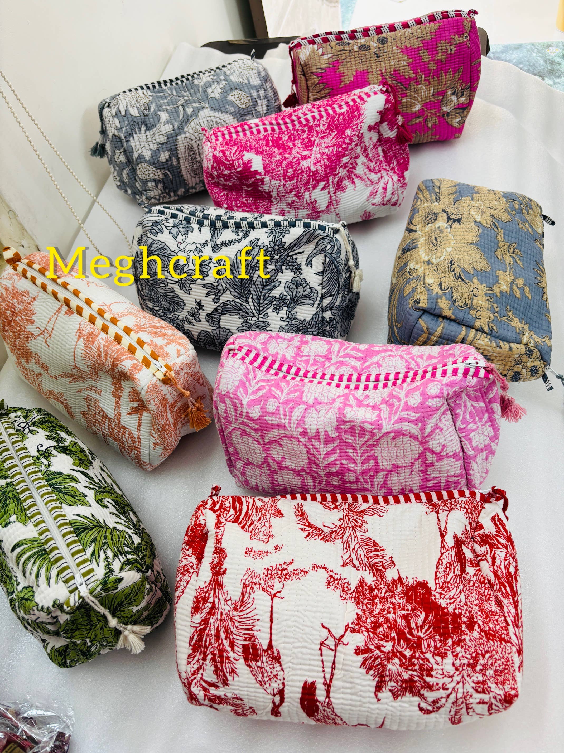 Personalisierte, gesteppt genähte Kosmetiktasche – Großpackung mit bedruckten Blockmuster-Taschen – bunte Kulturbeutel – Waschbeutel für Damen. Details: - Stoff: Blockbedruckte, gesteppte 100 % Baumwolle - Innenlage: Wasserdichtes Polyethylen mit 4 Fächern - Hergestellt in Indien - Maße der 3 Taschen im Set: Tasche 1: 22,9 x 12,7 x 14 cm Tasche 2: 20,3 x 12,7 x 10,15 cm Tasche 3: 17,75 x 10,15 x 8,9 cm Verwendungszwecke: Indische Baumwolle mit floralem Handblockdruck – ideal als Kulturbeutel, Reisetasche, Make-up-Tasche, gesteppte Waschbeutel, Rasier-Set oder Kosmetikkoffer.