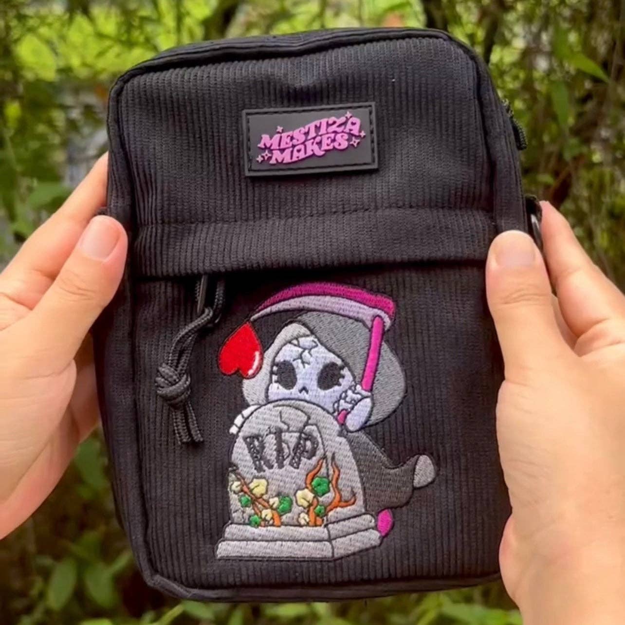♡ Seitentasche aus besticktem Clownfrosch und schwarzem Kord, 25,4 x 7,5 x 6,3 cm ♡ Abnehmbarer und verstellbarer 70-Zoll-Riemen, 3 Taschen (Netzhülle innen, Tasche mit Reißverschluss auf der Vorderseite, Ärmel auf der Rückseite), Metallbeschläge ♡ Gestreiftes Futter (grünes Futter nicht mehr verfügbar) ♡ Perfekt, um Ihren Switch/Ihr kleines Tablet, Ihre täglichen Utensilien und mehr zu verstauen!