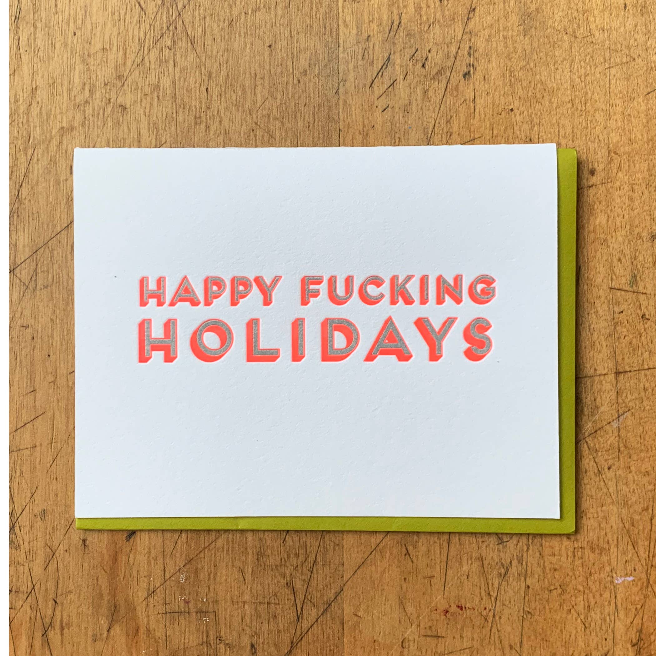 Grüne und silberne Tinte auf Canaletto Premium White Papier, gepaart mit einem hellen Neon-Korallen-Umschlag. A2-Größe (4,25 „x 5,5") gefaltet, innen unbedruckt. Verpackt als 6er-Set in einer klaren starren Box. Handgedruckt auf antiken Buchdruck-Geräten in Portland, Oregon. Auch als Einzelkarte erhältlich.