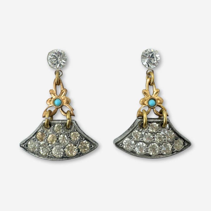 Umgearbeitete Vintage-Fan-Ohrringe mit klarem Strass-Glied und schwarzem Tropfen.