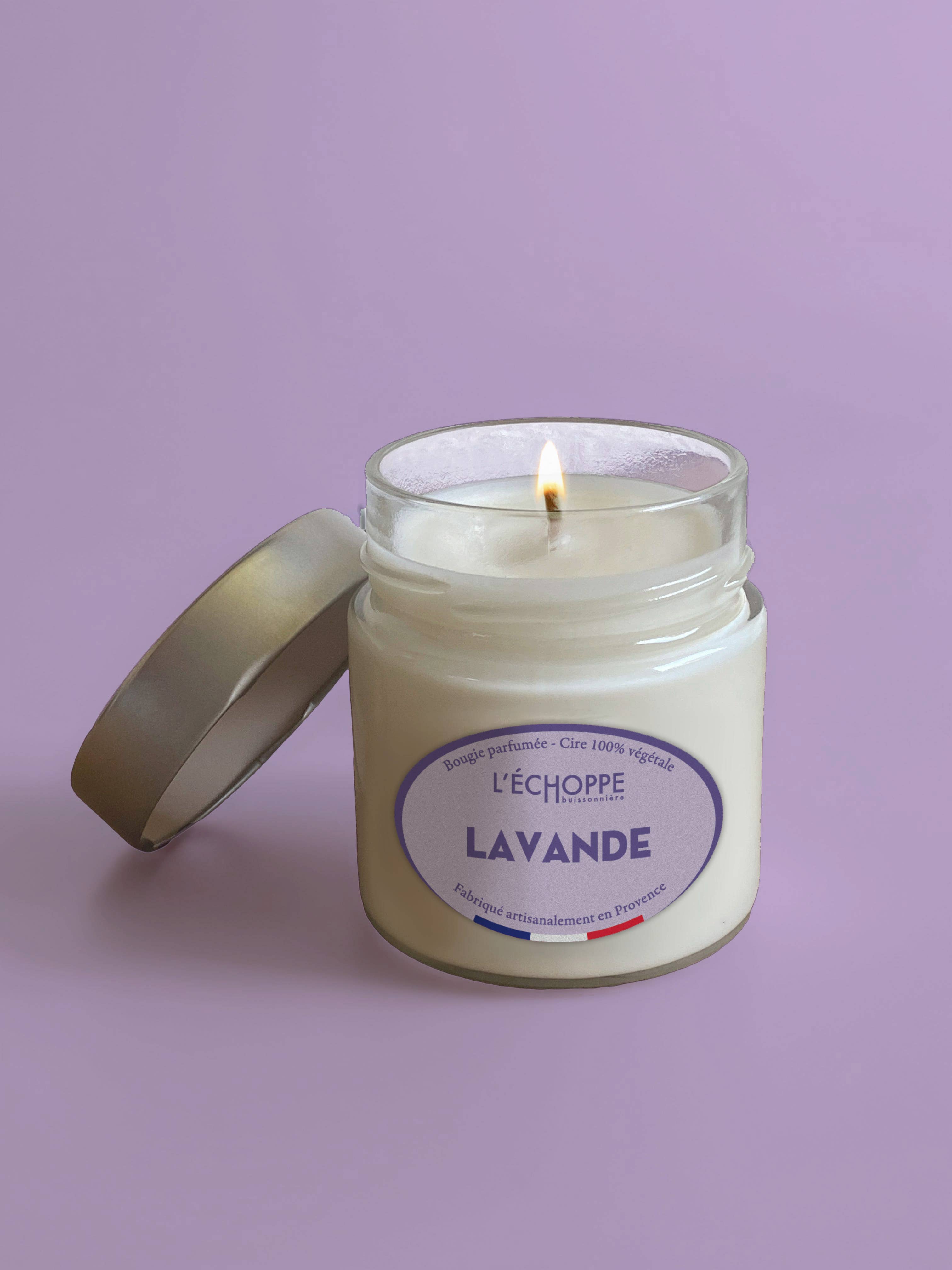 RUNDES GLAS MIT METALLDECKEL Duftkerze aus 100 % pflanzlichem Sojawachs Baumwolldocht Brenndauer: 45 h Nettogewicht: 180g Duft aus Grasse Handgefertigt in Frankreich Die Lavendelkerze bietet einen frischen, blumigen und beruhigenden Duft, typisch für die Felder der Provence. Ein entspannender und reiner Duft, ideal für einen Moment der Entspannung.