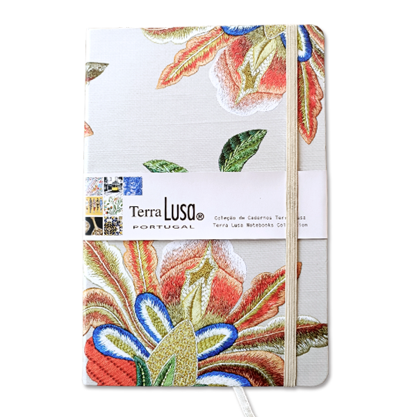 Terra Lusa Notizbuchkollektion Thema inspiriert von der natürlichen Seidenstickerei aus Castelo Branco. Dieses Notizbuch hat einen Hardcover-Einband im Format A5 (15 x 21 cm), 200 glatte Seiten mit 80 g/m², eine Innentasche, ein Lesebändchen und ein Gummiband zum Verschließen.