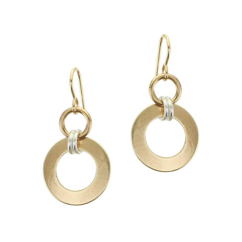 Eine ausgeschnittene Messingscheibe, die über einen glatten Silberring und eine kleine Würfelperle geschichtet ist. Ein süßer Ohrring aus gemischtem Metalldraht. Abmessungen: 0,8 Zoll breit und 1 Zoll lang (gemessen von der Basis des Ohrdrahtes). Trägeroptionen: Draht Verfügbare Metallfarben: Messing und Silber Stil # E9285DW