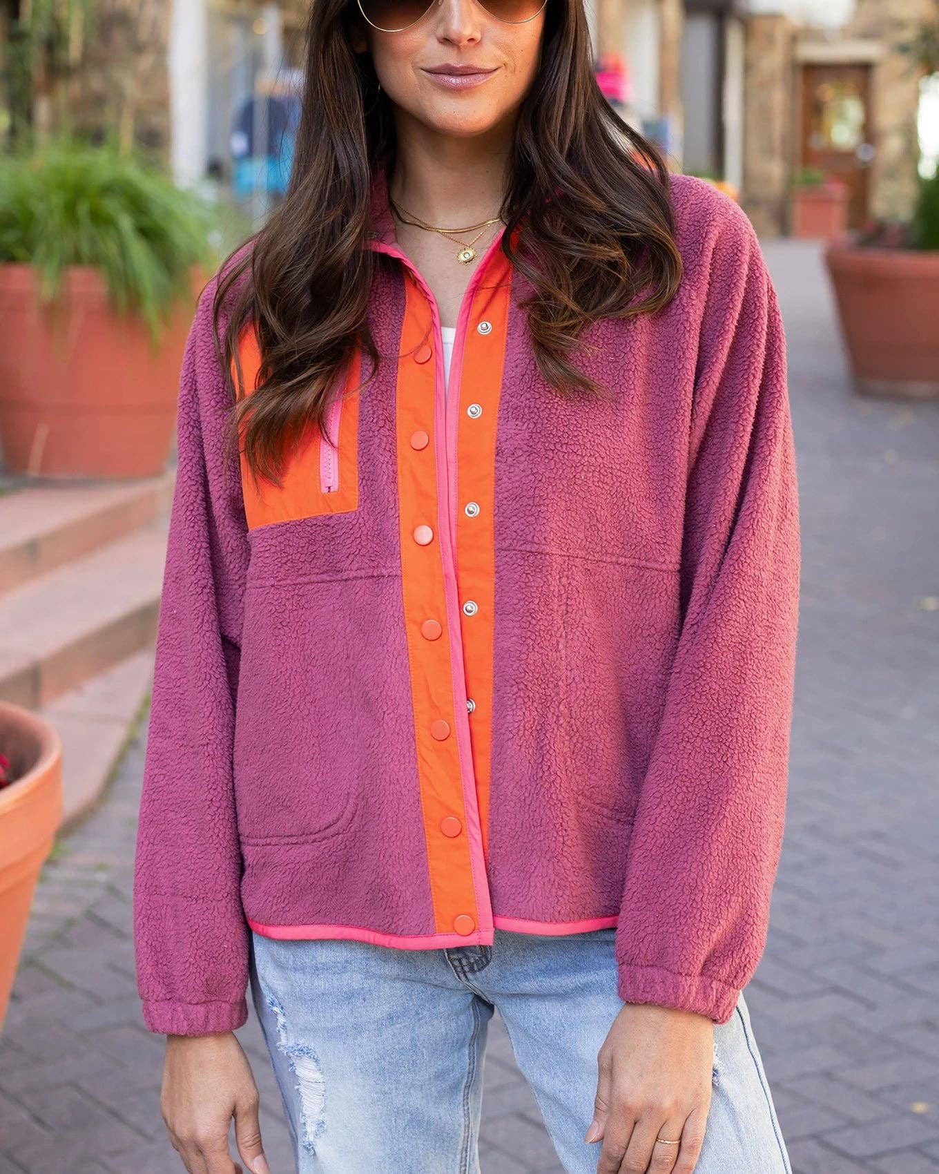 Einzelhandelspreis: 56,00 $ Kanadischer UVP: 86,94 $ Blaue Fleecejacke Die brandneue Colorblock-Fleecejacke bringt Spaß in die Funktionalität! Hergestellt aus weichem pastellblauem Fleece, verfügt diese Colorblock-Jacke über kontrastierende Details an Taschen und Besatz in Blush und Gelb, sodass Sie mit Leichtigkeit ein modisches Statement setzen können, während Sie Ihrem Alltagslook den letzten Schliff verleihen. Reißverschlusstaschen halten Ihre Hände wohlig warm und Ihr Telefon sicher verstaut, während der funktionale Druckknopfverschluss vorne es Ihnen ermöglicht, diese Jacke problemlos über T-Shirts und Tops zu tragen! Vertrauen Sie uns, sich an kühlen Tagen anzuziehen, hat sich noch nie so spaßig angefühlt! Warum Sie es lieben werden: * Bunte, Raglanärmel, Colorblock-Fleecejacke mit Knöpfen in Pastellblau und Blush * Trendige kontrastierende Farben am Kragen, vorne, an den Taschen und am Besatz * Funktionaler Druckknopfverschluss vorne, mit funktionalen Reißverschlusstaschen an Brust und Seite, die tief genug sind, um Ihr Telefon sicher zu verstauen * Die lockere Passform macht diese Fleecejacke einfach zu kombinieren an den frühen Frühlingstagen!